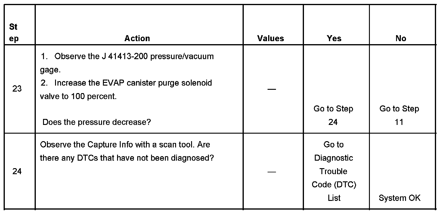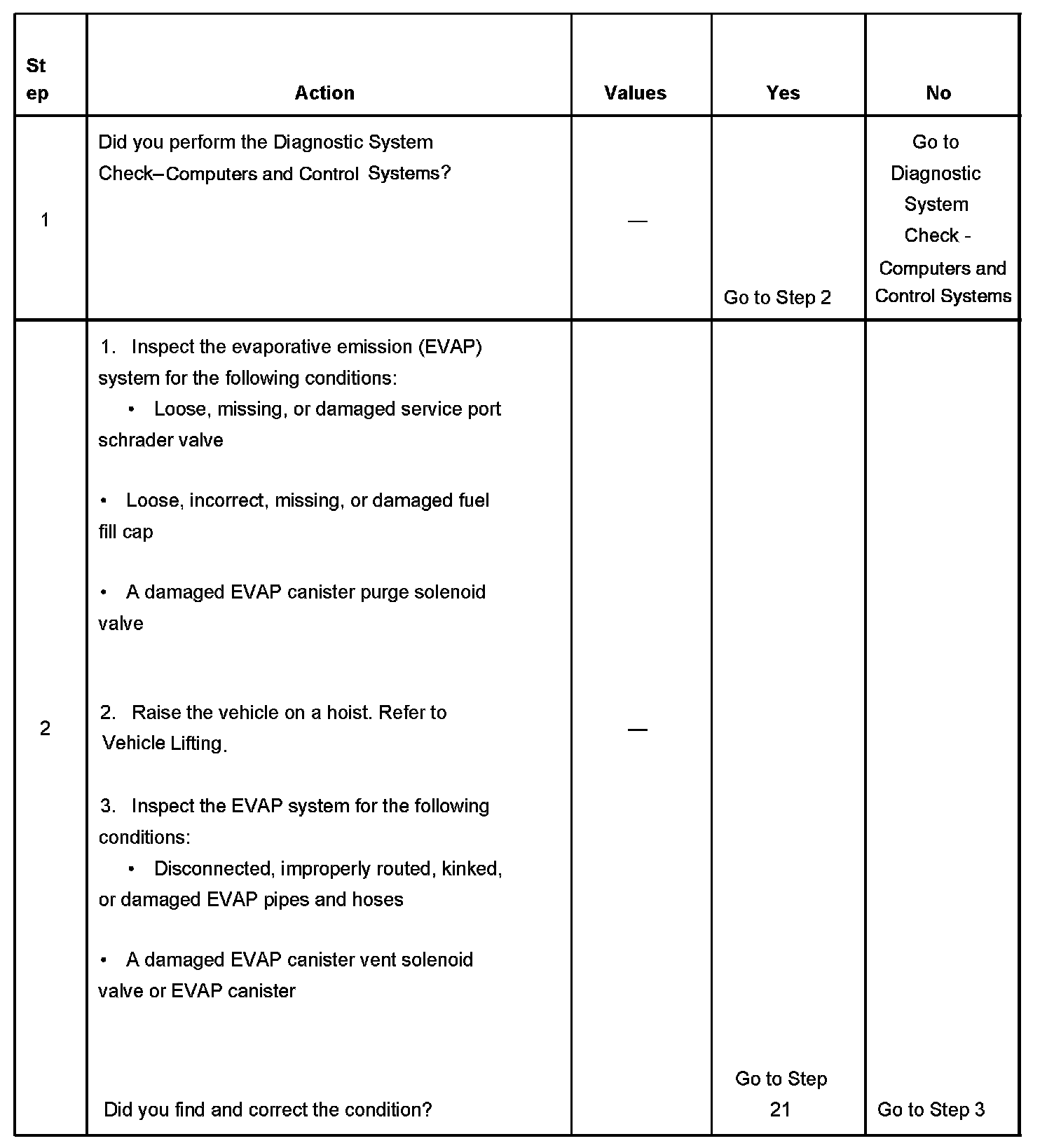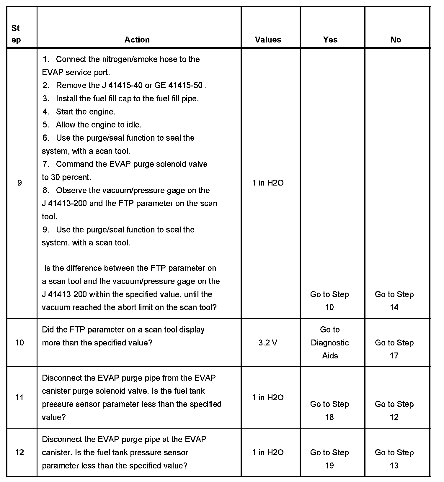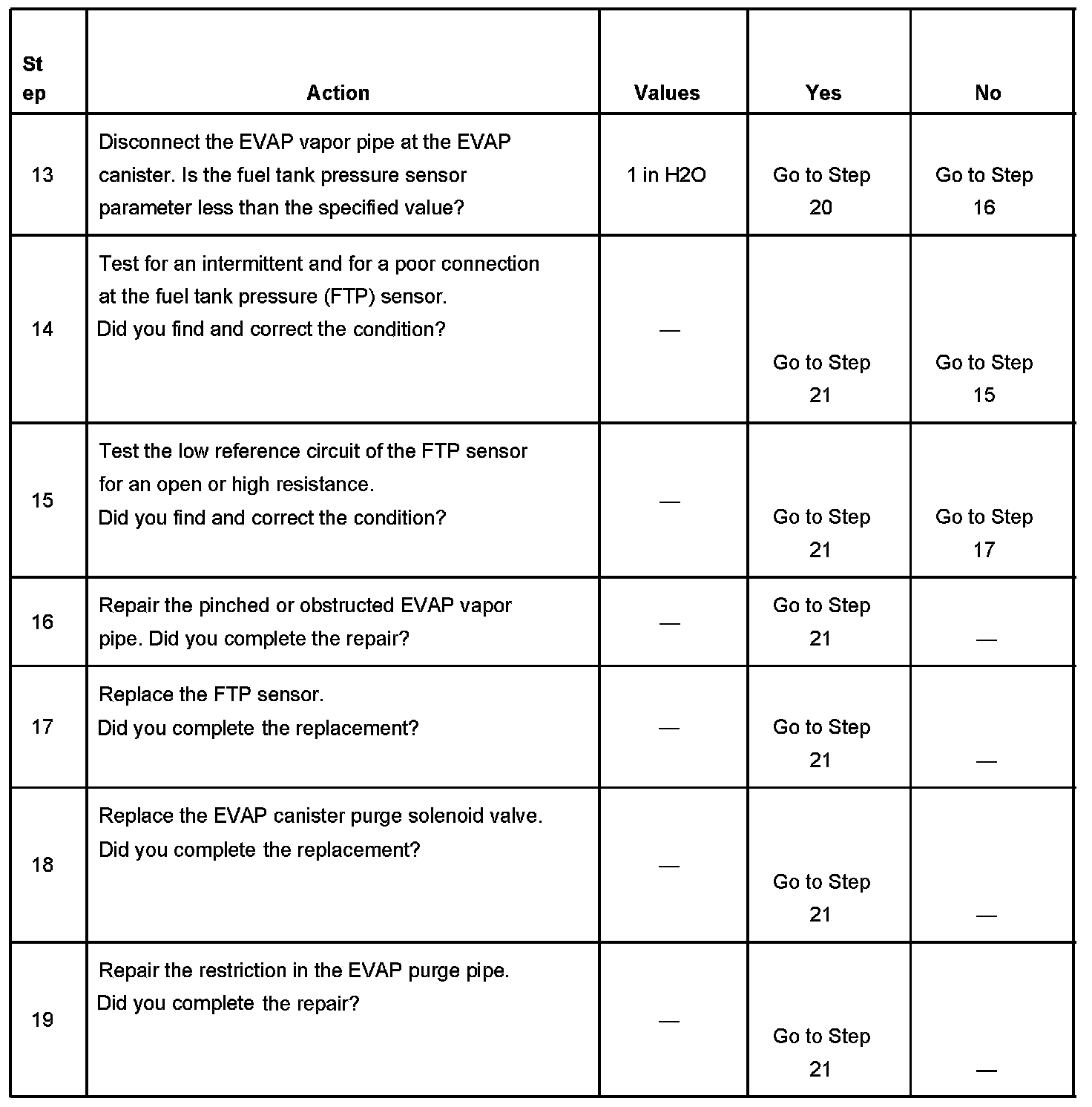 The control module tests the evaporative emission (EVAP) system for a large leak. The control module monitors the fuel tank pressure (FTP) sensor signal to determine the EVAP system vacuum level. When the conditions for running are met, the control module commands the EVAP canister purge solenoid valve open and the EVAP canister vent solenoid valve closed . This allows engine vacuum to enter the EVAP system. At a calibrated time, or vacuum level, the control module commands the EVAP canister purge solenoid valve closed, sealing the system, and monitors the FTP sensor input in order to determine the EVAP system vacuum level. If the system is unable to achieve the calibrated vacuum level, or the vacuum level decreases too rapidly, this DTC sets.