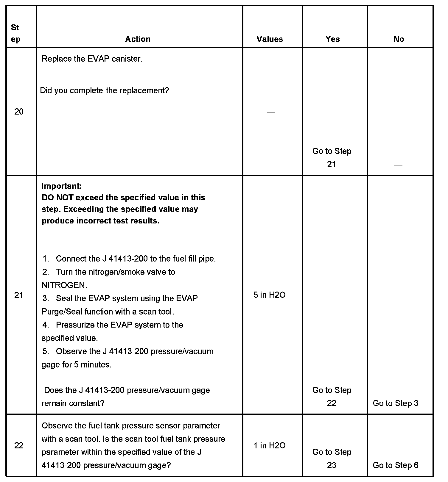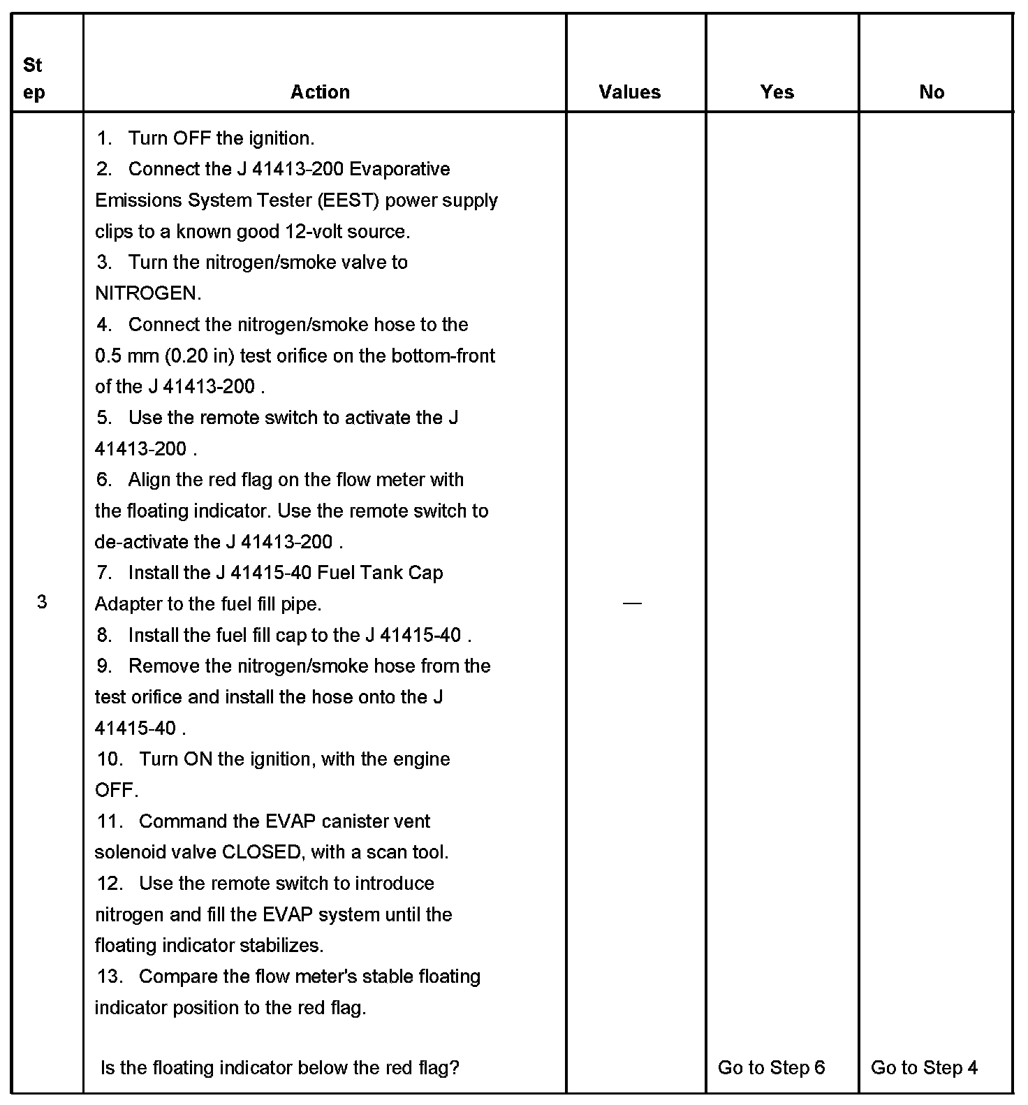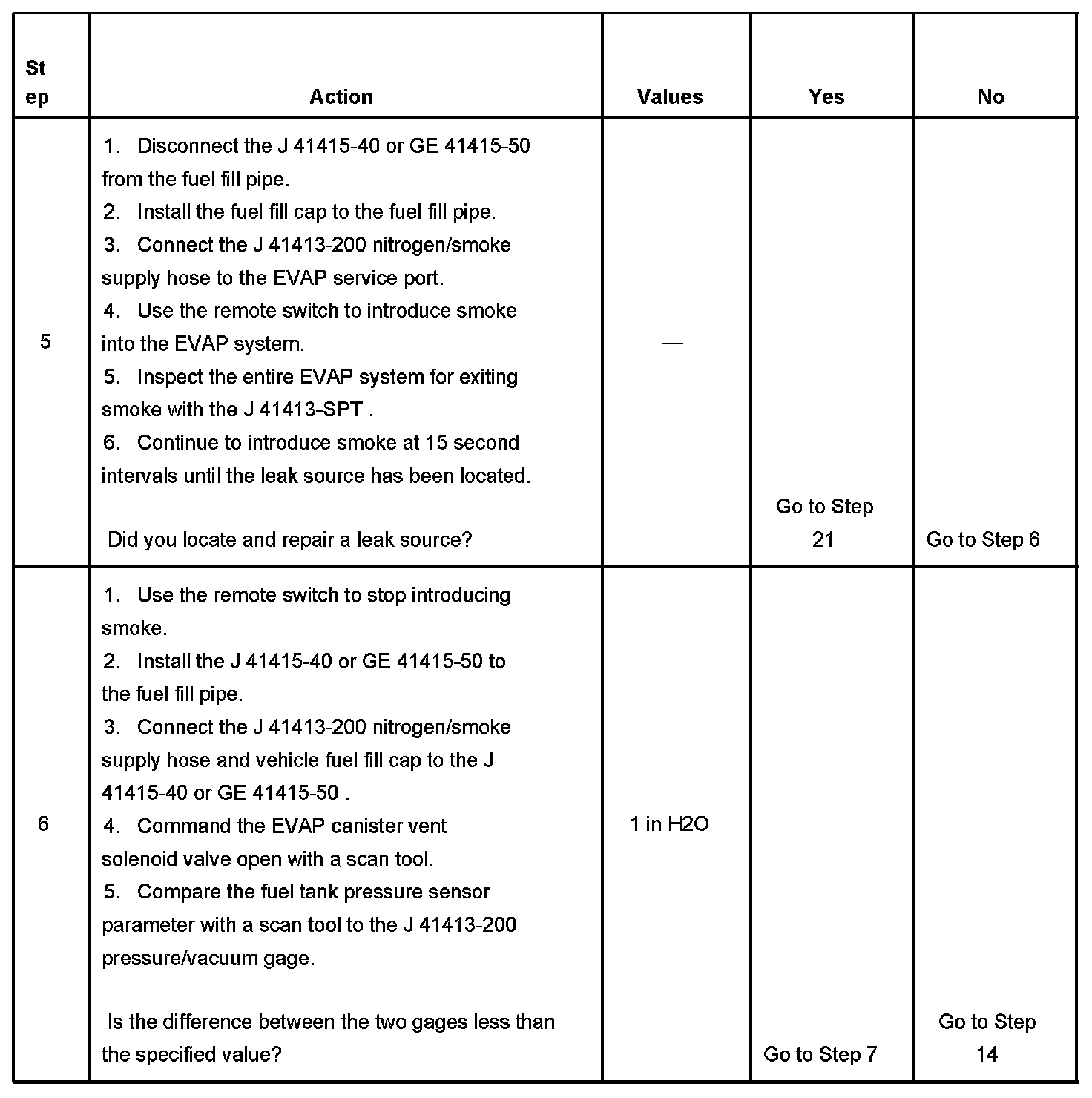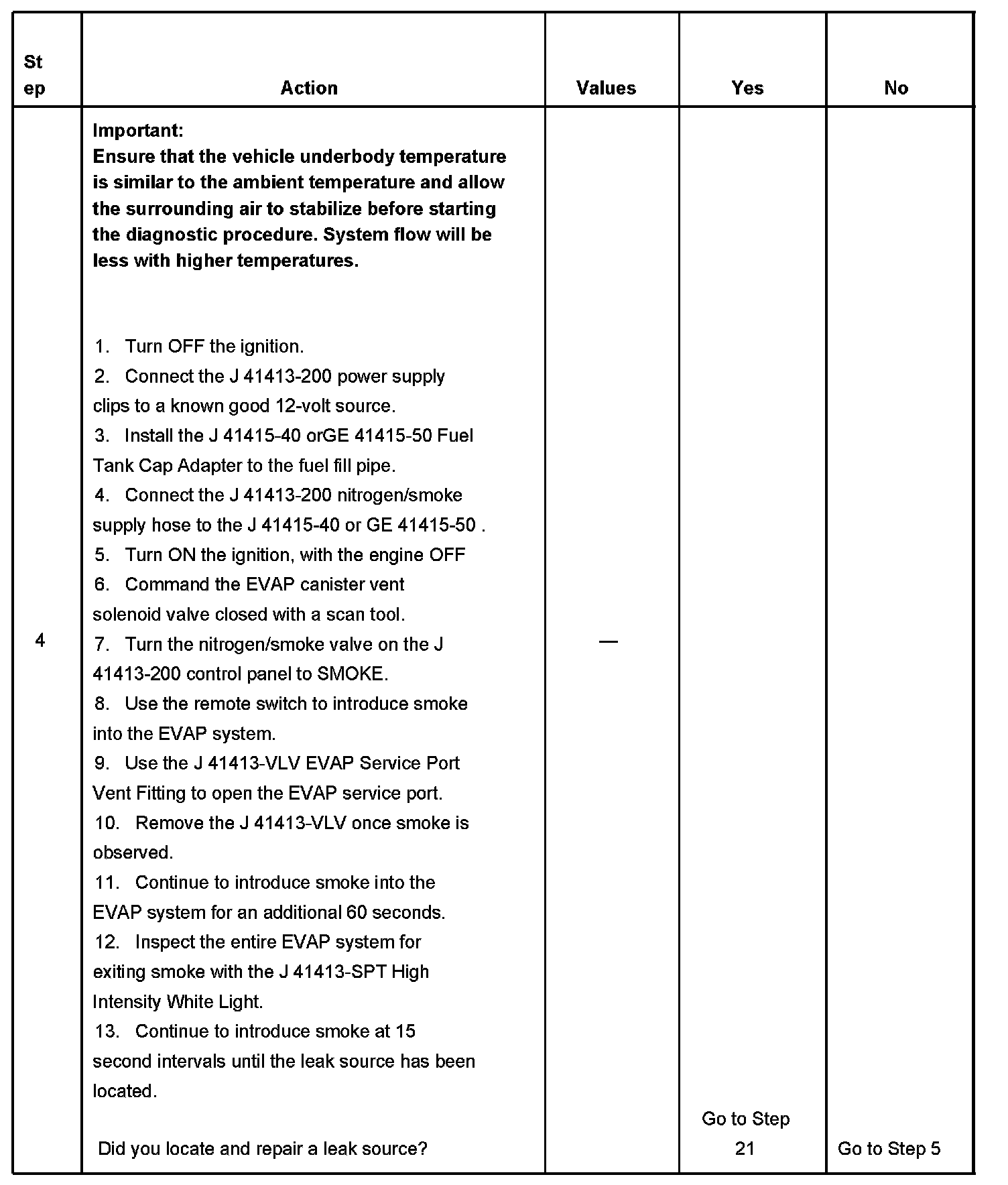 • To help locate intermittent leaks, use the J 41413-200 Evaporative Emissions System Tester (EEST) to introduce smoke into the EVAP system. Move all EVAP components while observing smoke with the GE-41413-SPT High Intensity White Light. Introducing smoke in 15 second intervals will allow less pressure into the EVAP system. When the system is less pressurized, the smoke will sometimes escape in a more condensed manner.