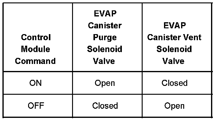 The following table illustrates the relationship between the ON and OFF states, and the OPEN or CLOSED states of the EVAP canister purge and vent solenoid valves.