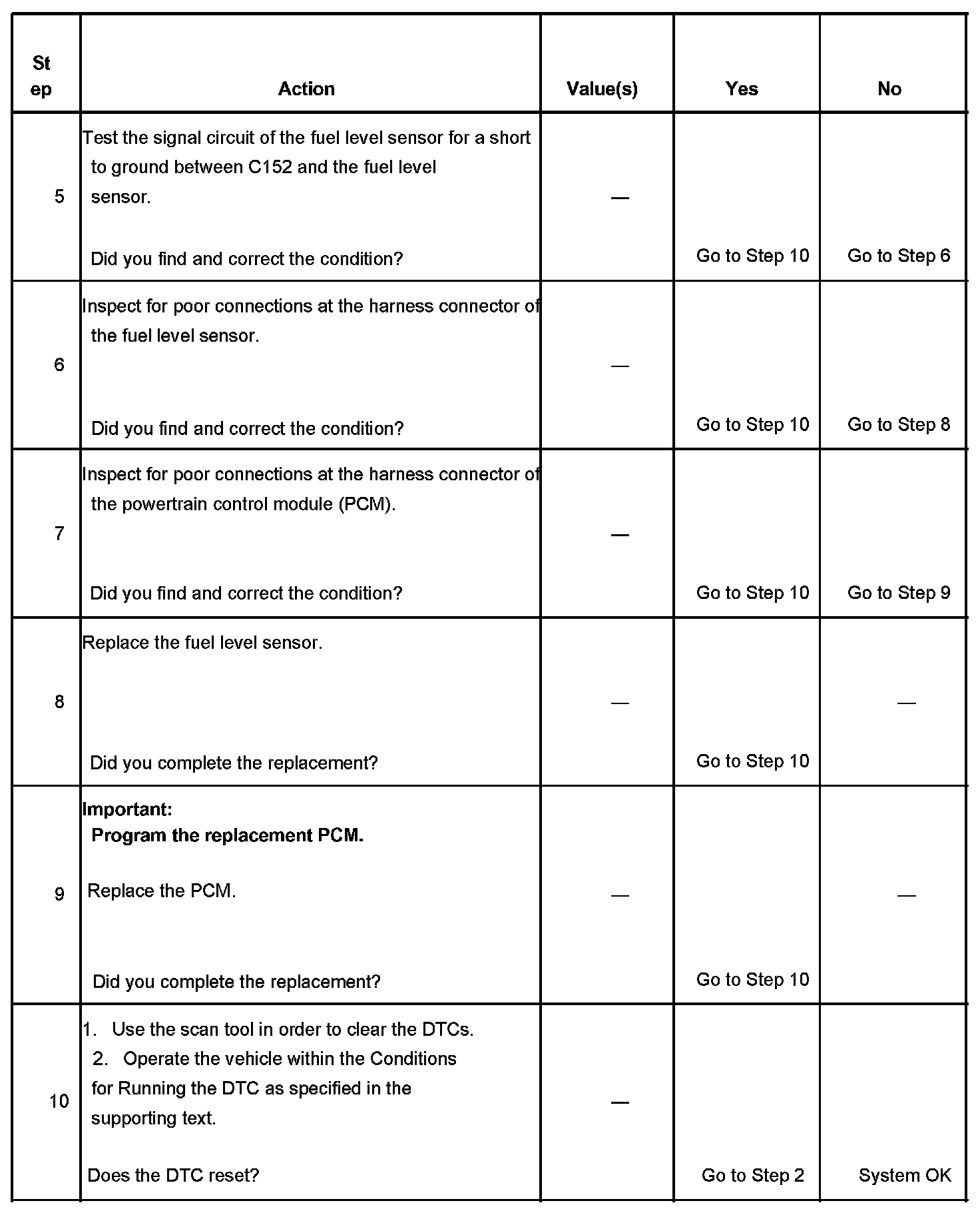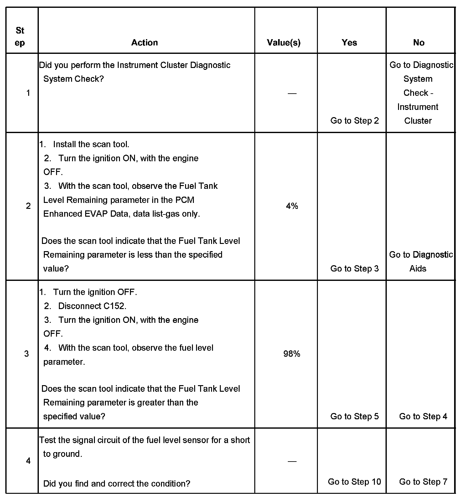 The fuel level sensor changes resistance in response to fuel level. The powertrain control module (PCM) monitors the signal circuit of the fuel level sensor in order to determine the fuel level. When the fuel tank is full, the sensor resistance is high and the PCM senses a high signal voltage. When the fuel tank is empty, the sensor resistance is low and the PCM senses a low signal voltage. The PCM uses the signal circuit of the fuel level sensor in order to calculate the percentage of remaining fuel in the tank. The PCM sends the fuel level percentage via the class 2 serial data circuit to the instrument cluster in order to control the fuel gage. The fuel level information is also used for misfire and evaporative emission (EVAP) diagnostics.