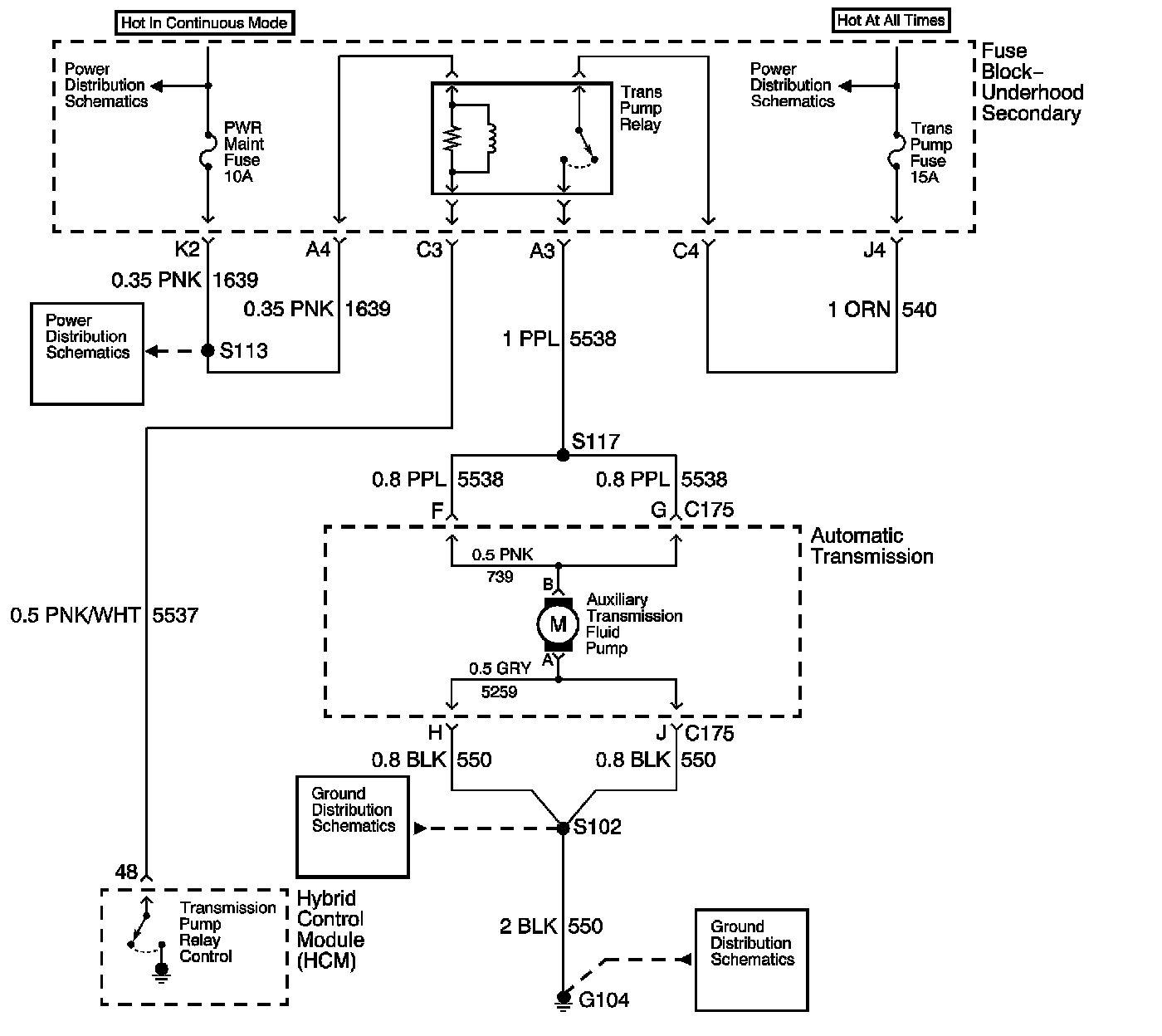 The Auxiliary Transmission Fluid Pump is an electrical device that is used with the Auxiliary Transmission Fluid Pump Relay to maintain Transmission Fluid line pressure to the forward clutch during Engine Idle Off mode. Engine Idle Off mode may also be referred to as PHT Engine Idle Off State. The Auxiliary Transmission Fluid Pump attaches to the transmission valve body assembly. The Auxiliary Transmission Fluid Pump Relay receives voltage through the Battery Positive voltage circuit. The Hybrid Control Module (HCM) controls the Auxiliary pump by providing the ground path on the Auxiliary Pump relay control circuit. The HCM monitors the Auxiliary Transmission Fluid pump relay control circuit voltage.