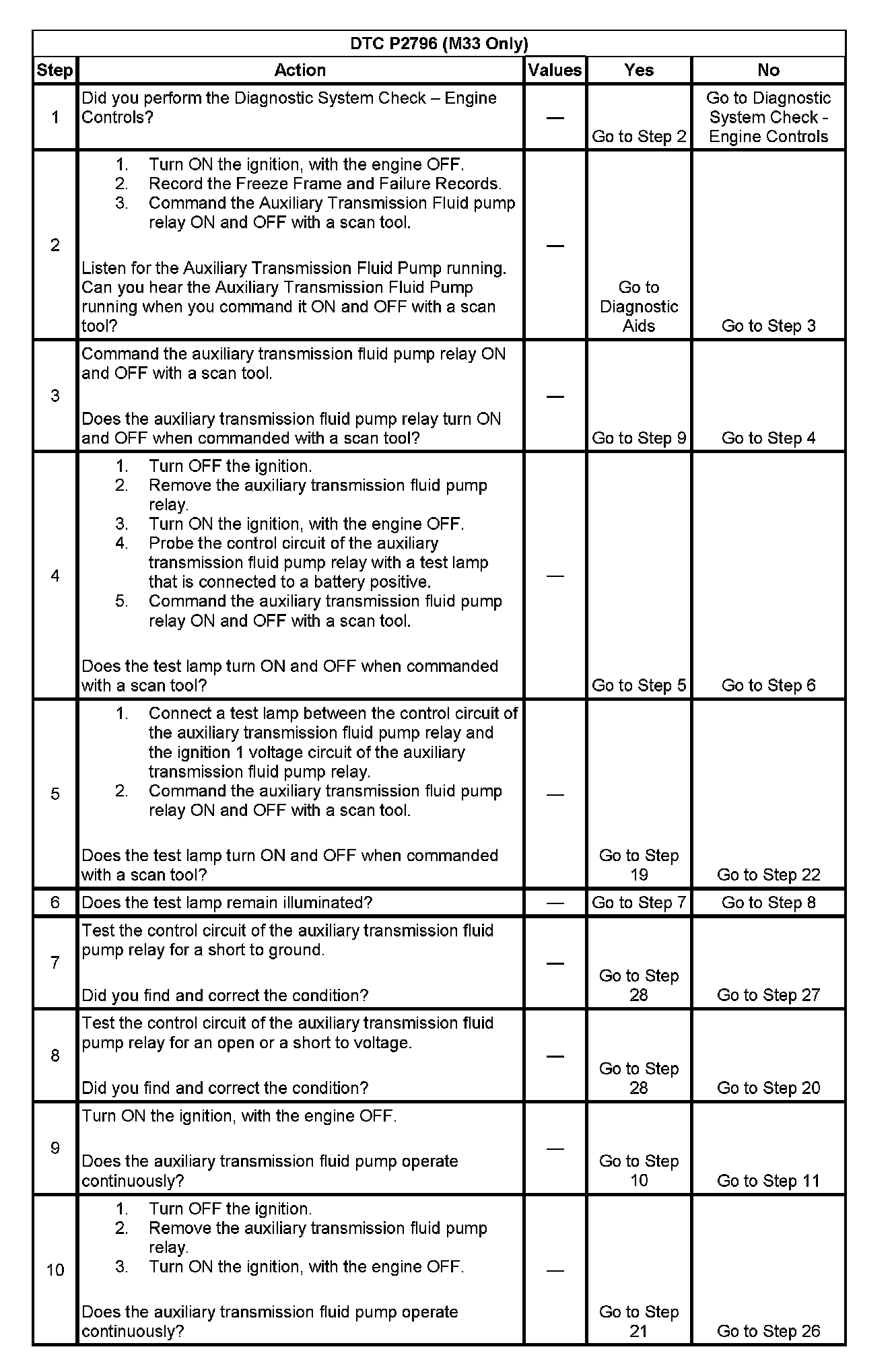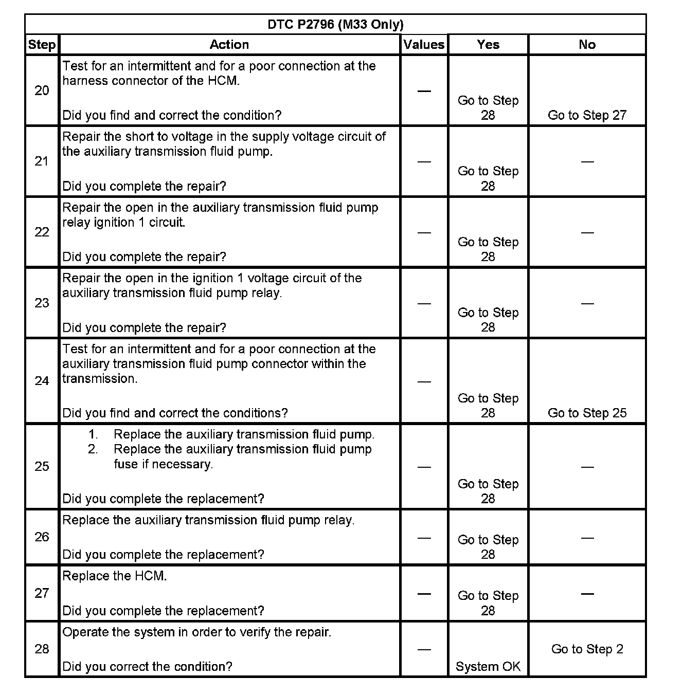 When the HCM detects a continuous open, short to ground or short to power in the Auxiliary Transmission pump circuit, then DTC P2796 sets. DTC P2796 is a type B DTC.