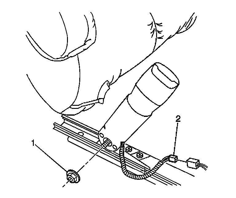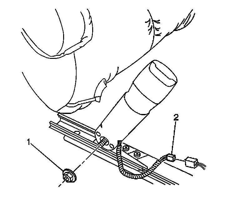 7. Remove the inboard seat belt buckle and nut (1). Disconnect the electrical connection (2).