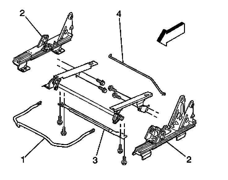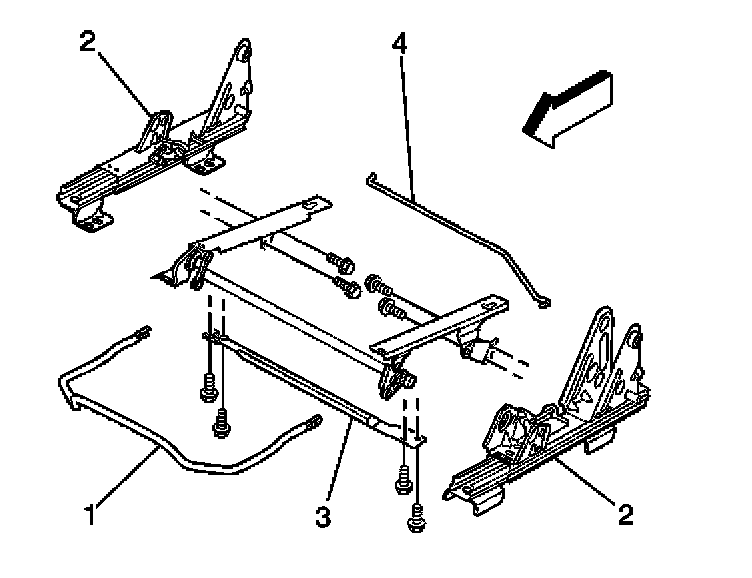 8. Remove the bar (1) from the adjuster tracks (2). Straighten the tabs in order to remove the bar.