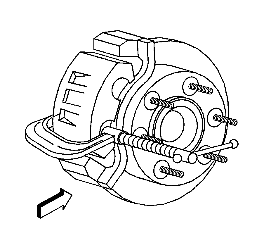 Support the brake caliper with heavy mechanic's wire, or equivalent, whenever it is separated from its mount and the hydraulic flexible brake hose is still connected. Failure to support the caliper in this manner will cause the flexible brake hose to bear the weight of the caliper, which may cause damage to the brake hose and in turn may cause a brake fluid leak.