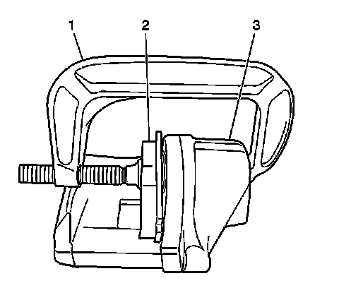 1. Using a C-clamp (1), bottom the piston into the caliper bore. Use an old brake pad (2) or wooden block placed across the face of the piston. Do not damage the piston or the caliper boot.