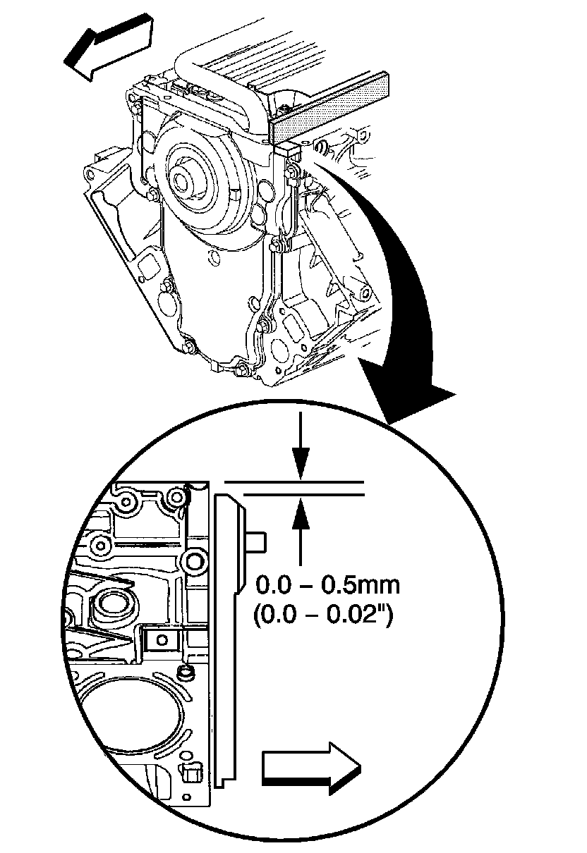 1. Insert a feeler gage between the front cover and the straight edge tool. The cover must be flush with the oil pan surface or no more than 0.5 mm (0.02 inch) below flush.