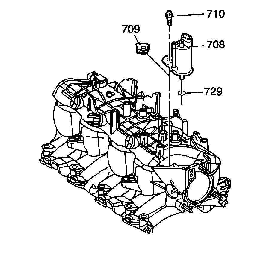 8. Install the evaporative emission (EVAP) purge solenoid (708), bolt (710), and isolator (709).