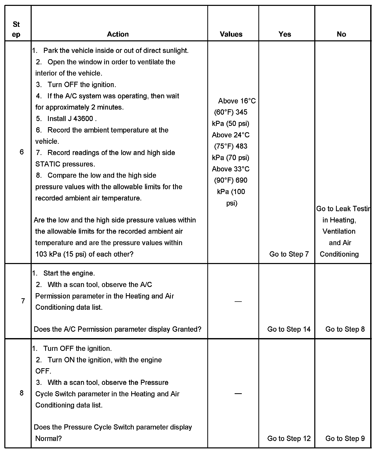 8. The A/C low pressure switch parameter is out of range when the HVAC control module interprets the signal being below 151 kPa (22 psi).
