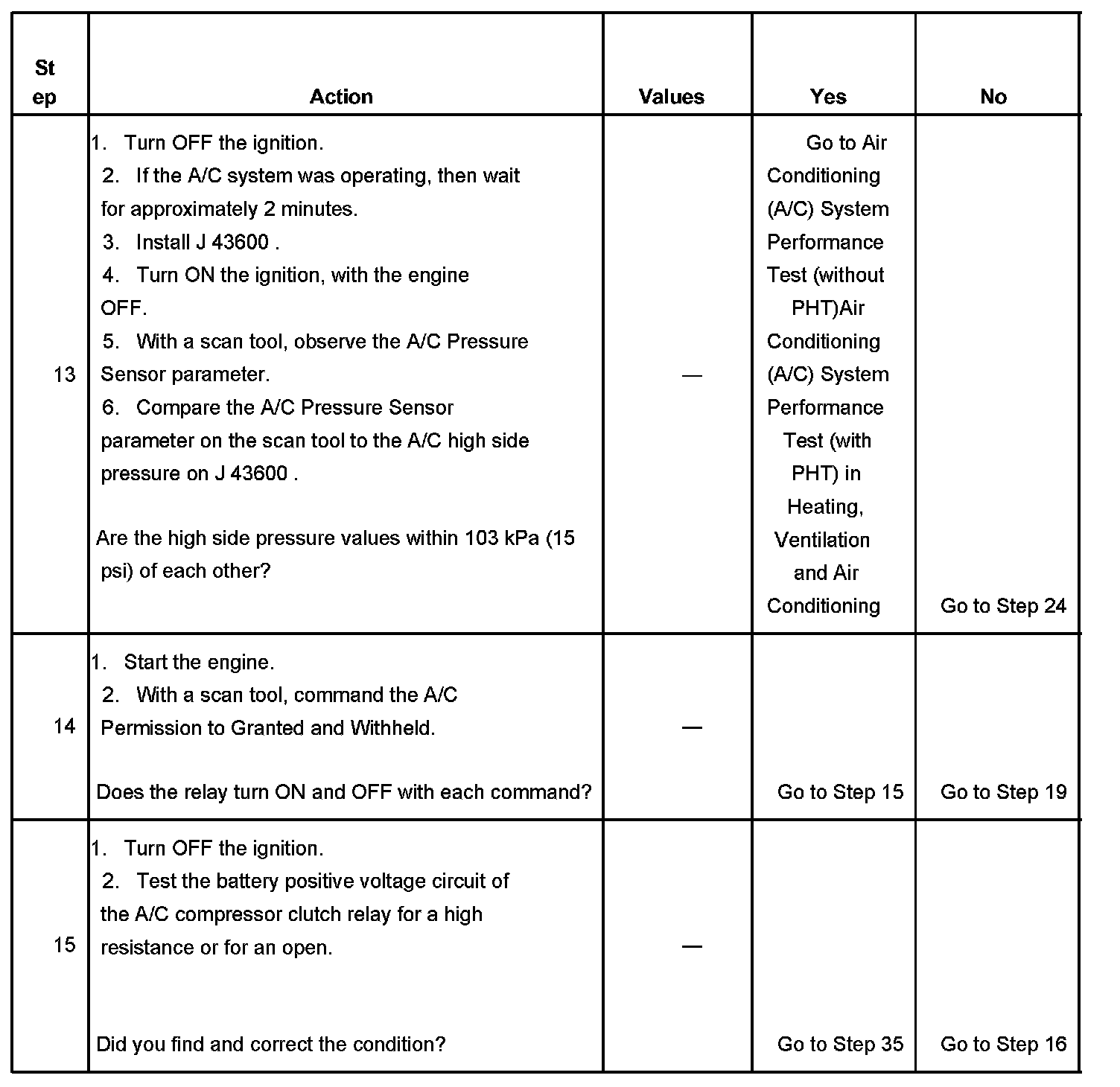 12. The A/C compressor relay output from the powertrain control module (PCM) is disabled if the A/C high side system pressure is interpreted to be higher than 2958 kPa (429 psi).