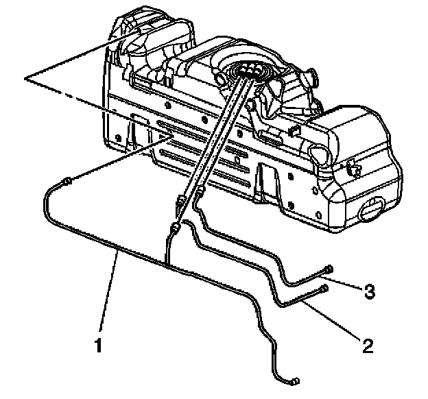 2. Disconnect and remove the EVAP line (1) from the roll over valve, sending unit and retaining clips.