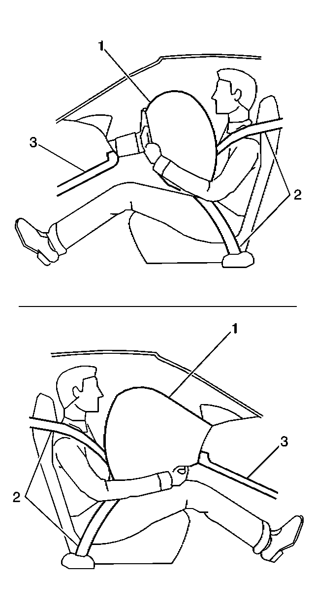 The supplemental inflatable restraint (SIR) system supplements the protection offered by the occupant's seat belt system (2). The SIR system may contain several inflator modules located throughout the vehicle, i.e. steering wheel module (1) and instrument panel (I/P) module (1). In addition to inflator modules, the vehicle contains an inflatable restraint passenger presence system (PPS) that measures the weight of an occupant sitting in the front passenger seat. The PPS uses the weight of the occupant to determine if the I/P inflator module will be enabled or disabled. Each inflator module has a deployment loop that is controlled by the sensing and diagnostic module (SDM) mounted inside the vehicle. The SDM determines the severity of a collision with the assistance of various sensor inputs. When the SDM detects a collision of sufficient force it will process the information provided by the sensors to further support air bag deployment. The SDM performs continuous diagnostic monitoring of the SIR system electrical components. Upon detection of a circuit malfunction, the SDM will set a DTC and inform the driver by requesting the instrument panel cluster (IPC) to turn the AIR BAG indicator ON. The steering column (1) and knee bolsters (3) are designed to absorb energy and compress during frontal collisions in order to limit leg movement and decrease the chance of injury to the driver and passenger.