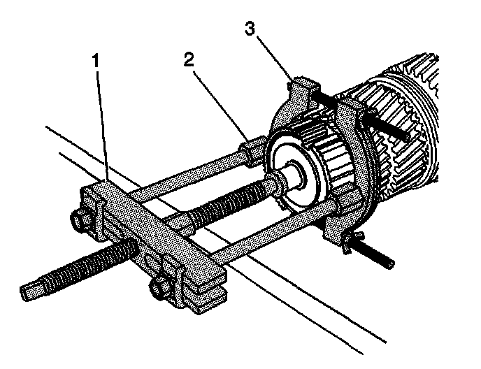 5. Using the J 44707 (1), the J 44759 (2), and the J 36513 (3), remove the 3rd /4th synchronizer hub from the mainshaft with the 3rd speed gear.