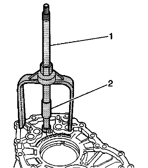 5. Remove the shift rail bearing from the intermediate case using the J 44736 (1) and the J 44737 (2). Expand the J 44737 (2) to fit securely in the bearing.