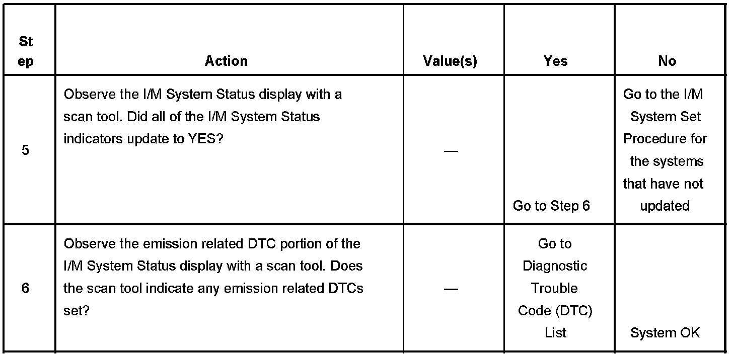 The scan tool can be used in order to monitor each of the I/M System Status indicators during the I/M Complete System Set Procedure. When all of the indicators for a test step have updated to YES, testing can move on to the next step even if the remaining portion of the test is not complete. For example, step 3 is designed to run the EVAP, AIR, and HO2S tests. The procedure instructs the technician to operate the vehicle in the enable conditions for 6 minutes. If all 3 tests have updated to YES within 4 minutes, you do not need to continue with the enable conditions and testing can advance to the next step.
