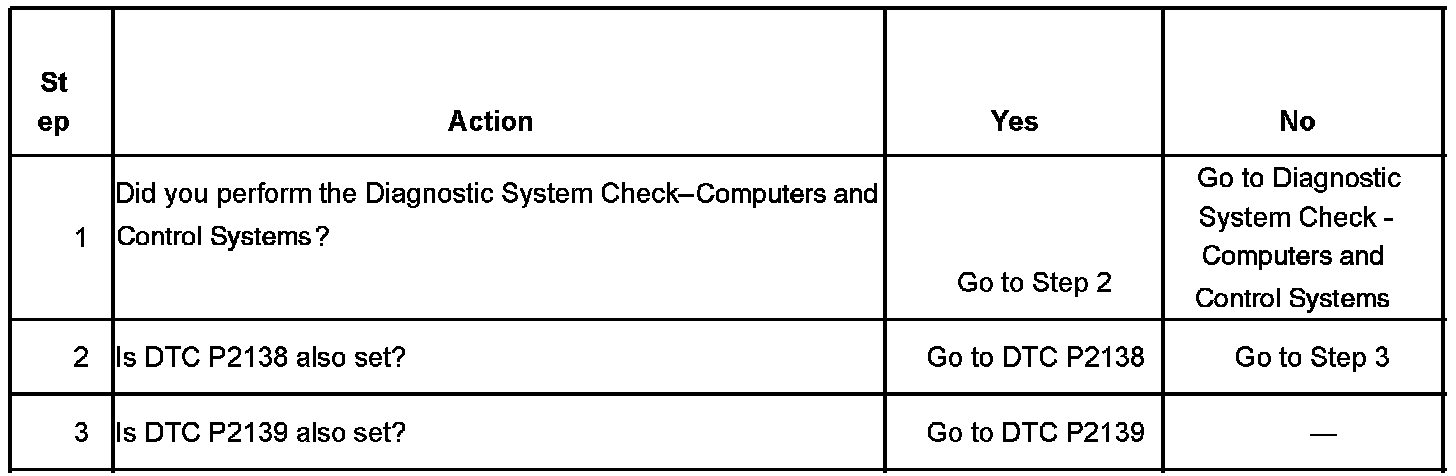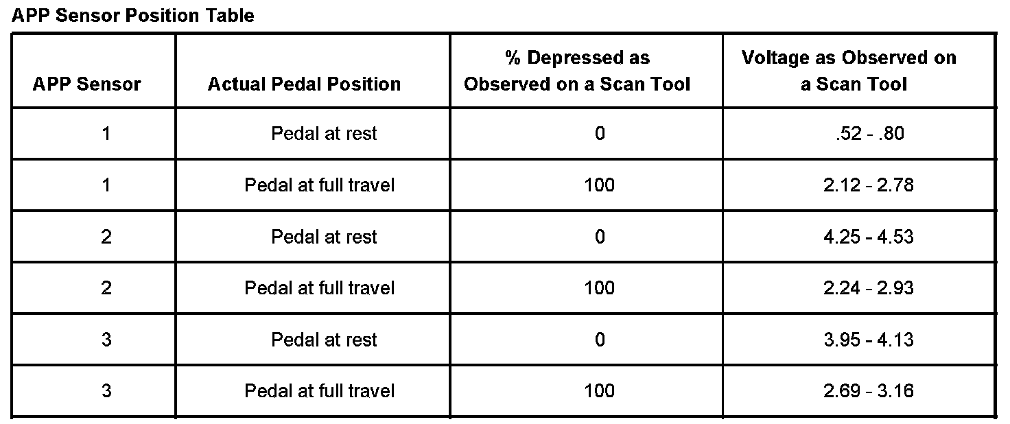 The accelerator pedal position (APP) sensor is mounted on the accelerator pedal control assembly. The sensor is made up of 3 individual sensors within one housing. Three separate signal, low reference, and 5-volt reference circuits are used in order to interface the APP sensor with the engine control module (ECM). Each sensor has a unique functionality to determine the pedal position as shown in the table. The ECM uses the APP sensor to determine the amount of acceleration or deceleration desired by the person driving the vehicle via the fuel injector control. This DTC sets if the ECM determines an out of range condition with the APP sensor.