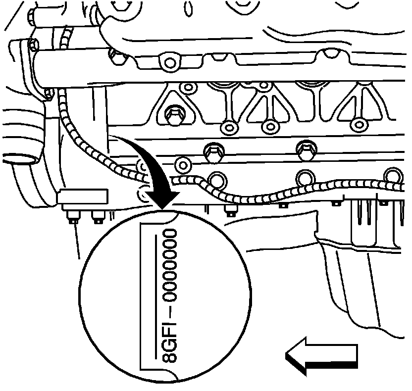 The engine identification tag is located on the left side of the block. It is on the front edge of the block.
