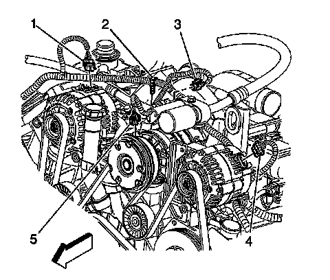 74. Install the engine wire harness clip to the engine bracket (5).