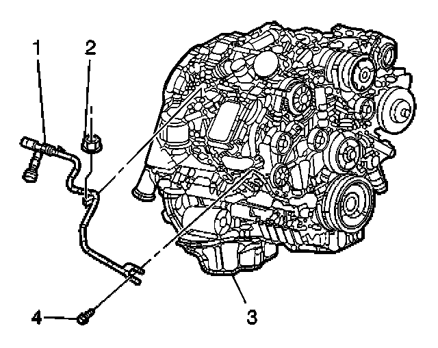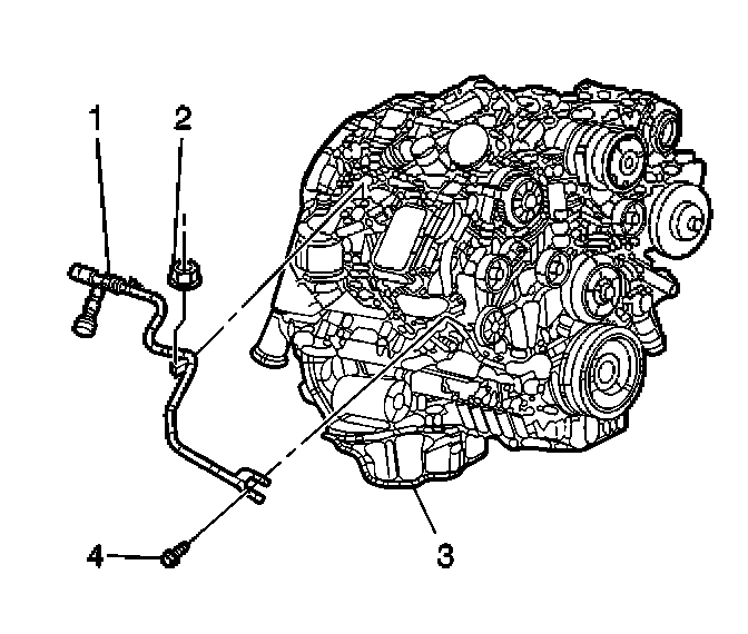 6. Remove the outlet heater hose bolt (3) from the engine. Discard the bolt.