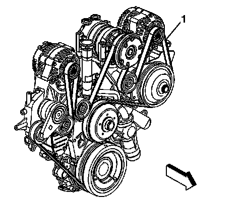 2. Install the drive belt (1) over all of the pulleys except the tensioner pulley, if equipped with a dual generators (Federal emissions).