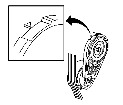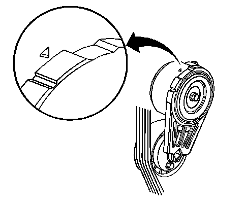 10. Confirm the proper drive belt size and the correct drive belt routing by observing the location of the pointer and index marks on the drive belt tensioner. With a new drive belt installed the pointer should align within the index marks on the drive belt tensioner.
