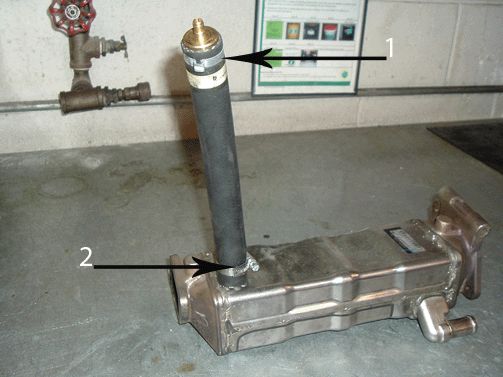 6. Connect the hose fitting (1) of pressure tester J-46091-1 Charge Air Cooler Tester Regulator to the EGR Cooler Hose Adapter (2) on the EGR cooler as shown.