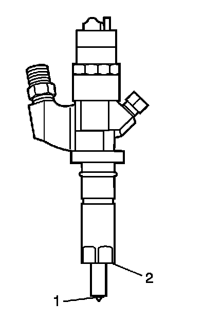 1. Use a soft bristle non-metallic brush and top engine cleaner, GM P/N 1052626 (Canadian P/N 993026) or equivalent, to remove any deposits from the nozzle tip (1) and the copper washer sealing area (2) before re-installation.