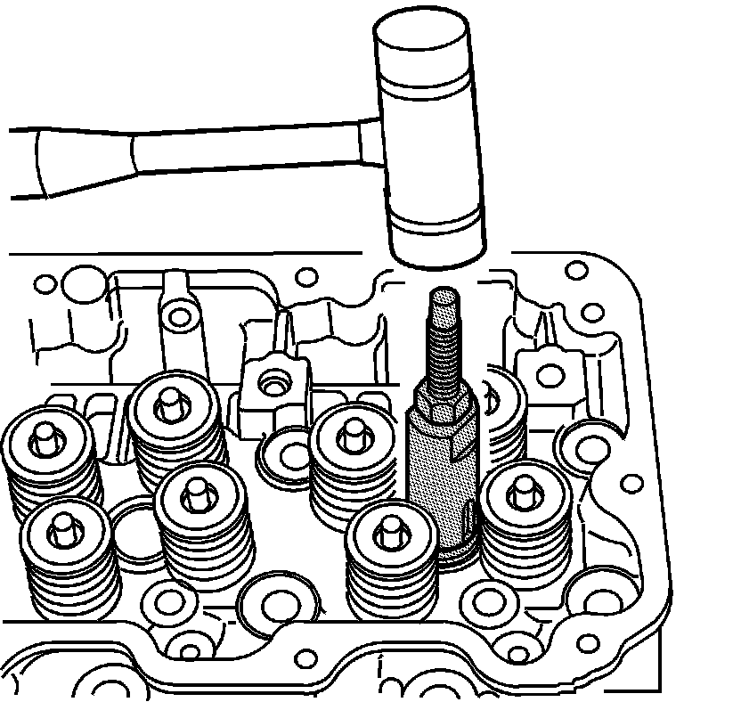6. Lightly tap on J 45910 with a hammer to install and seat the fuel injector sleeve.
