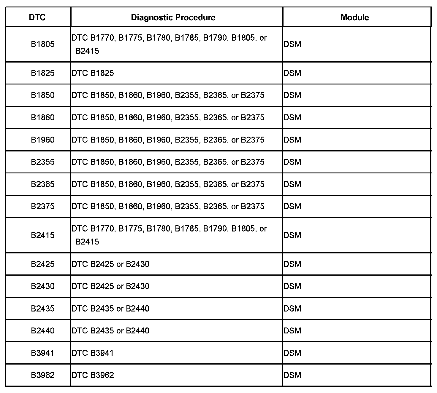 DTCs B1805 - B3962: