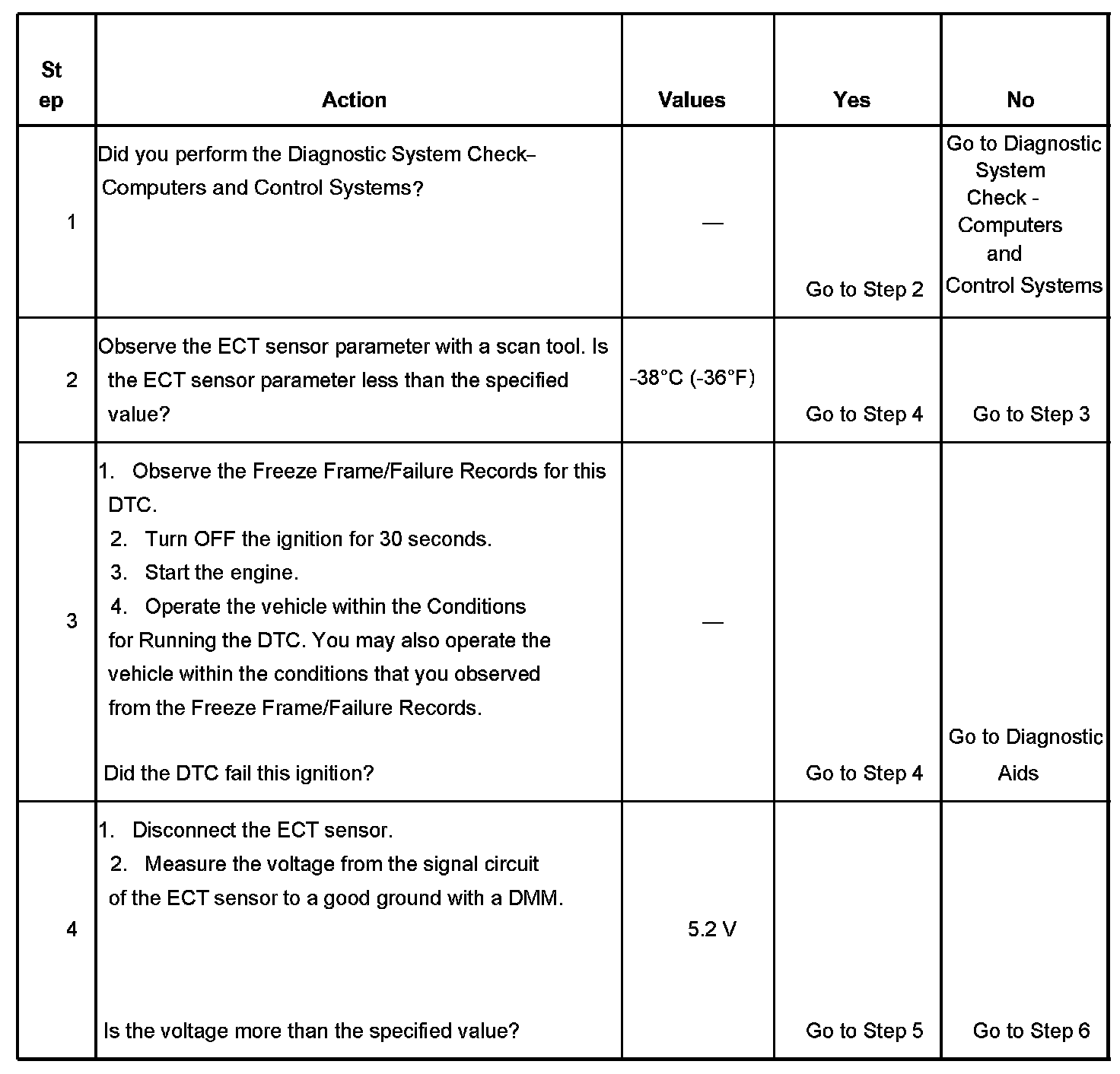 The PCM detects that the ECT sensor parameter is less than -38°C (-36°F) for 20 seconds.