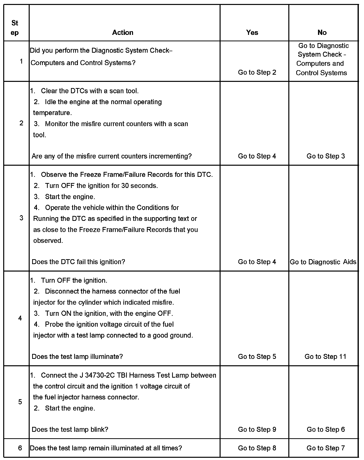The numbers below refer to the step numbers on the diagnostic table.