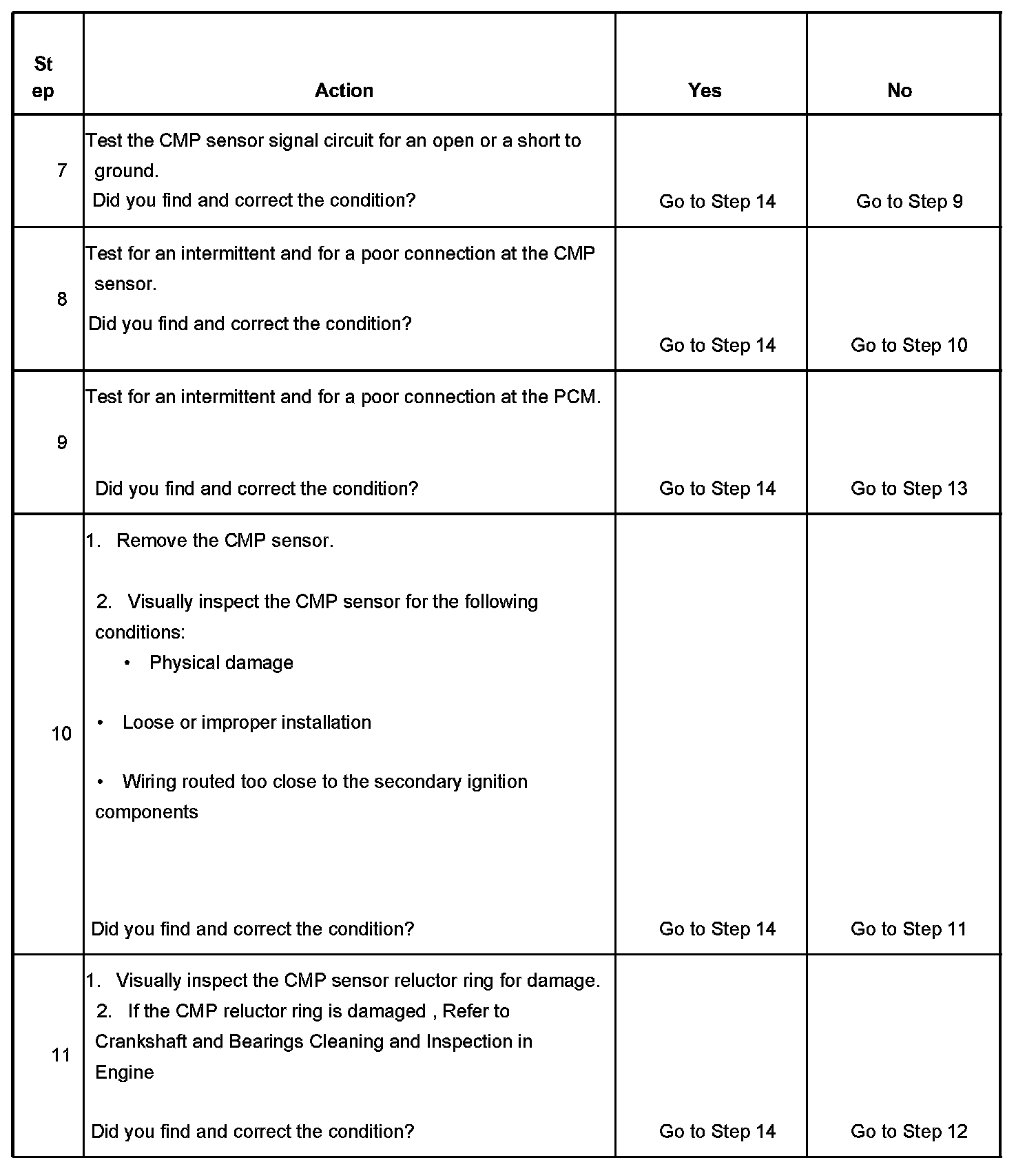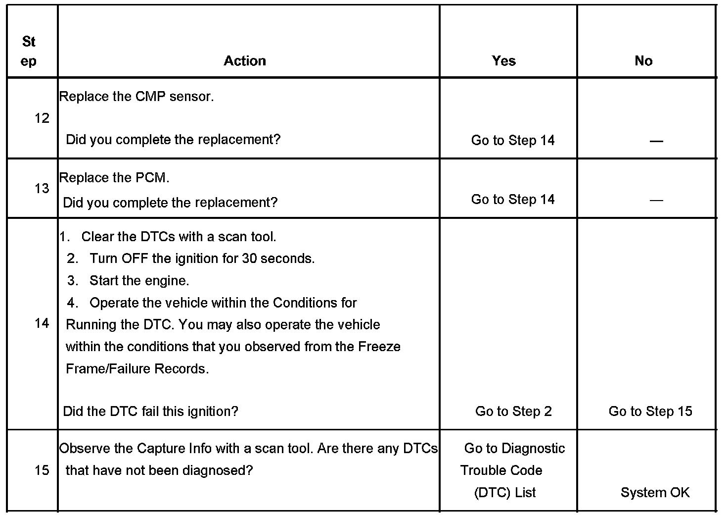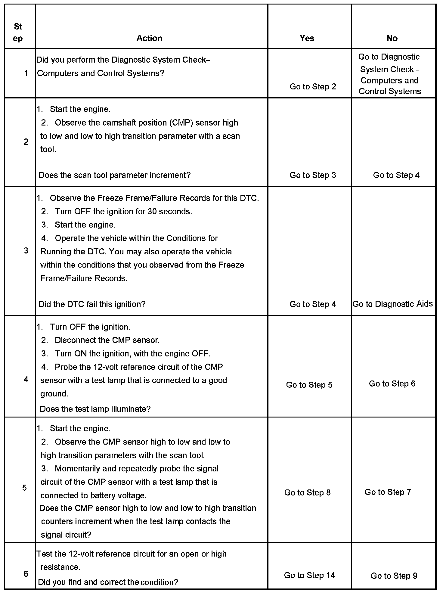 The CMP sensor 1 X signal is used by the PCM to determine if the cylinder at top dead center (TDC) is on the firing stroke or the exhaust stroke. The PCM can determine TDC for all cylinders by using the CKP sensor 24 X signal alone. The engine will start without a CMP signal as long as the PCM receives the CKP sensor 24 X signal. A slightly longer cranking time may be a symptom of this condition. The system attempts synchronization and looks for an increase in engine speed indicating that the engine started. If the PCM does not detect an increase in engine speed, the PCM assumes that the PCM incorrectly synchronized to the exhaust stroke and re-syncs to the opposite cam position. If the PCM detects that a CMP signal is constantly low, DTC P0342 sets.