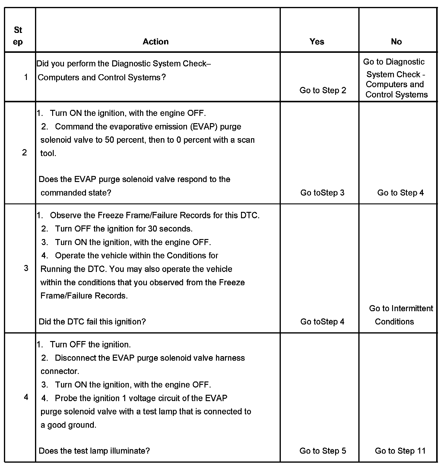 An ignition voltage is supplied directly to the evaporative emission (EVAP) canister purge solenoid valve. The EVAP canister purge solenoid valve is pulse width modulated (PWM). The scan tool displays the amount of ON time as a percentage. The control module monitors the status of the driver. The control module controls the EVAP canister purge solenoid valve ON time by grounding the control circuit via an internal switch called a driver. If the control module detects an incorrect voltage for the commanded state of the driver, this DTC sets.