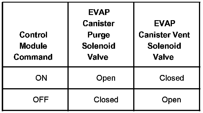 The table illustrates the relationship between the ON and OFF states, and the OPEN or CLOSED states of the EVAP canister purge and vent solenoid valves.
