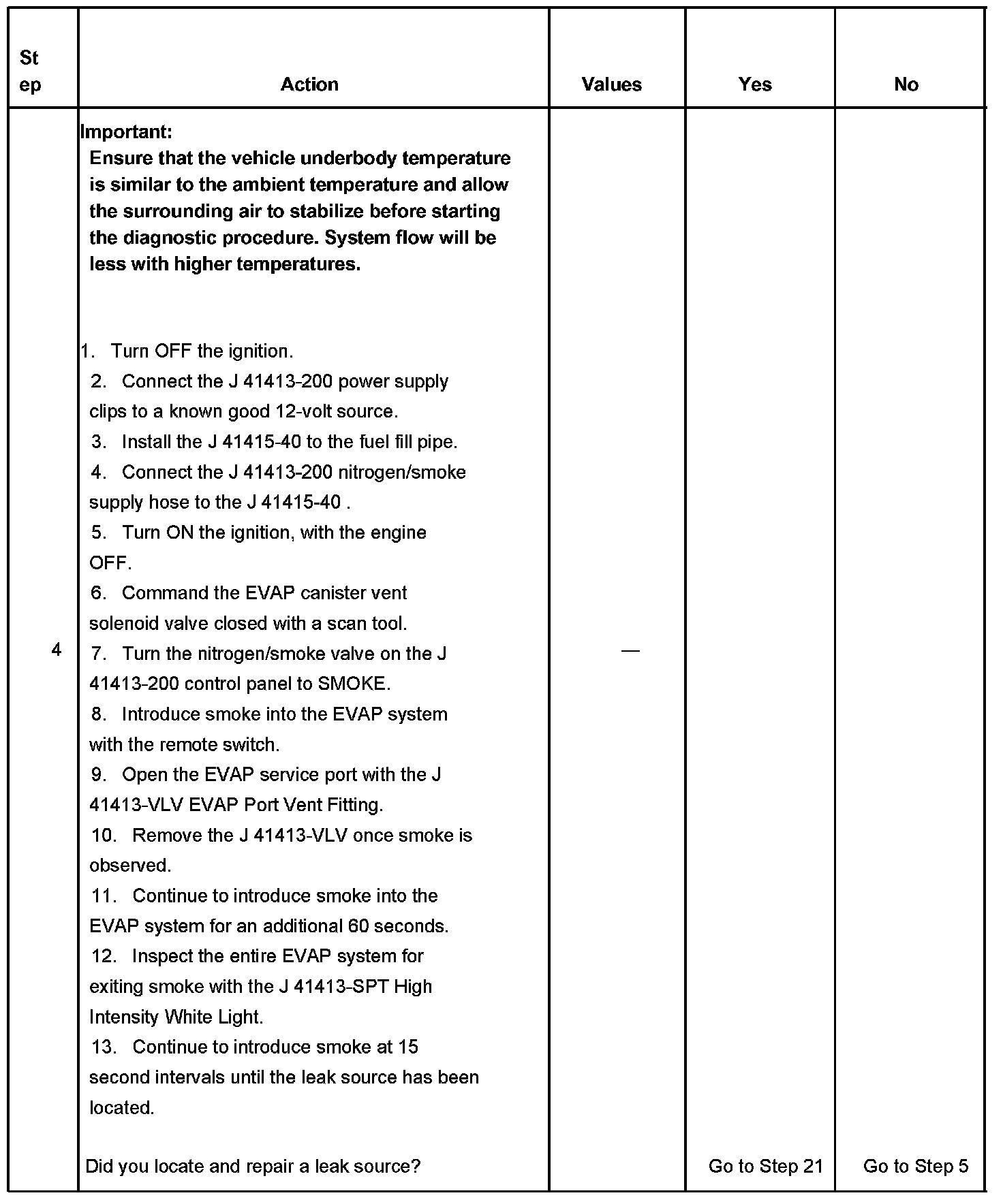 - To help locate intermittent leaks, use the J 41413-200 Evaporative Emissions System Tester (EEST) to introduce smoke into the EVAP system. Move all EVAP components while observing smoke with the J 41413-SPT High Intensity White Light. Introducing smoke in 15 second intervals will allow less pressure into the EVAP system. When the system is less pressurized, the smoke will sometimes escape in a more condensed manner.