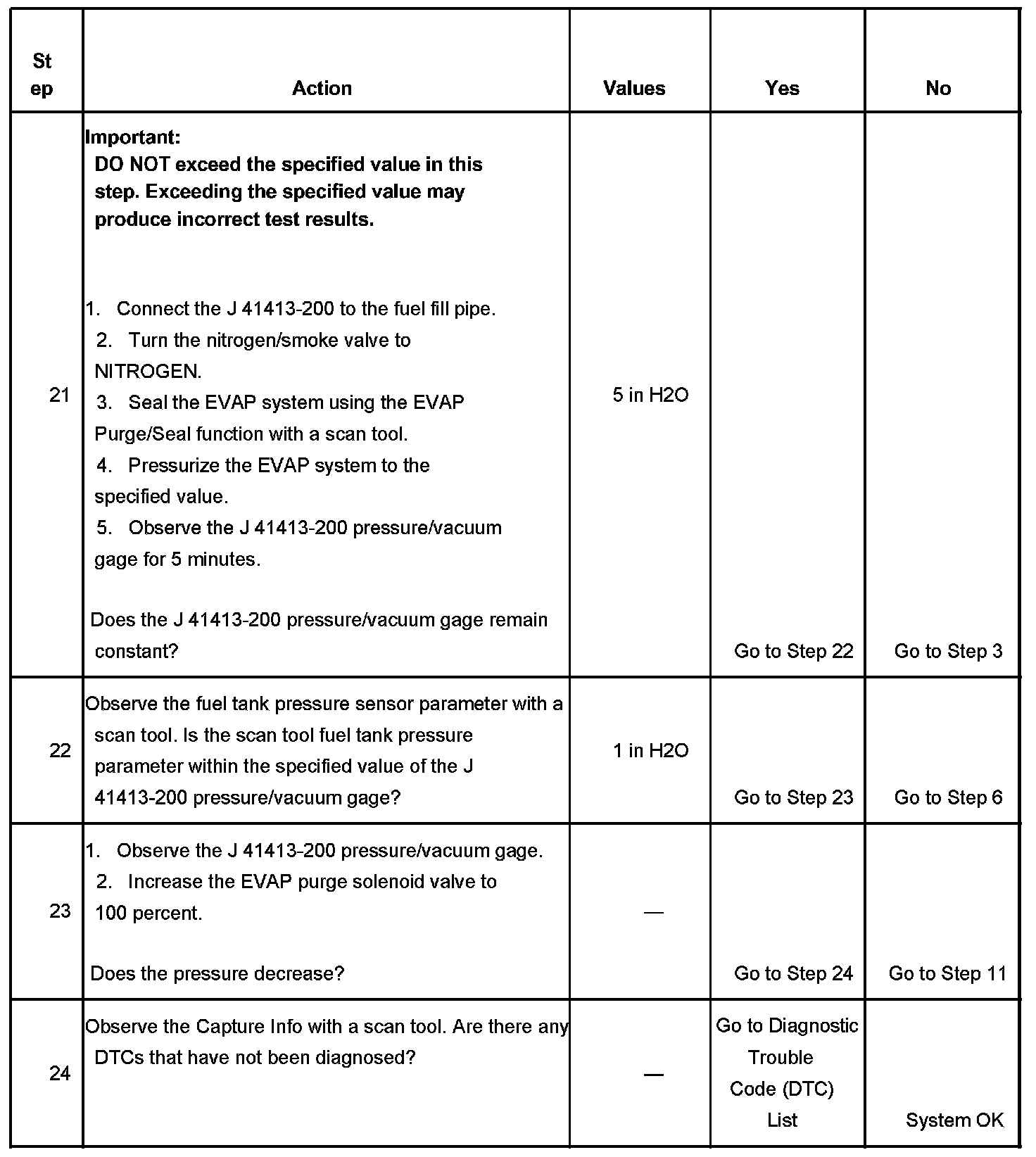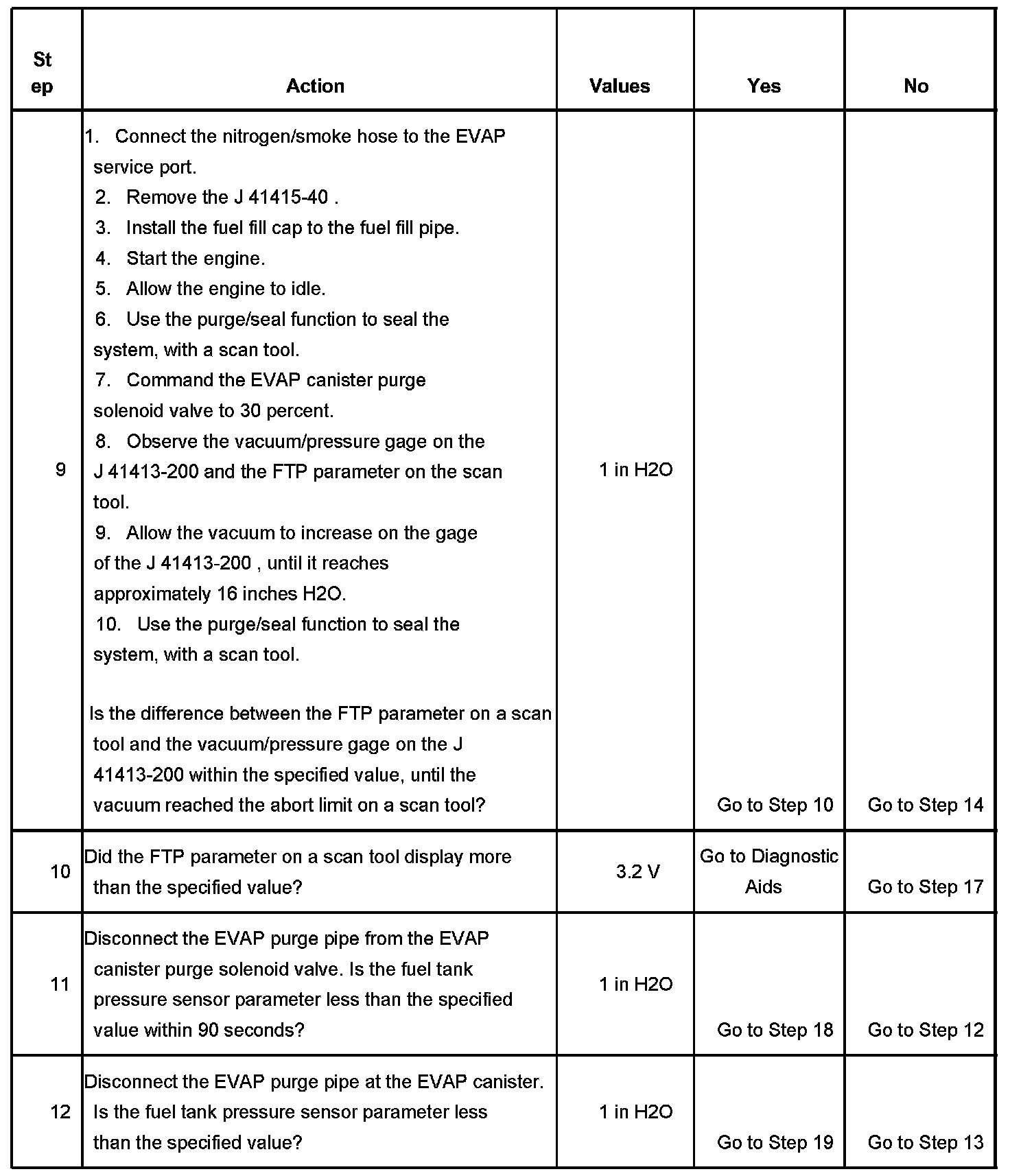 The control module tests the evaporative emission (EVAP) system for a large leak. The control module monitors the fuel tank pressure (FTP) sensor signal to determine the EVAP system vacuum level. When the conditions for running are met, the control module commands the EVAP canister purge solenoid valve OPEN and the EVAP canister vent solenoid valve CLOSED. This allows engine vacuum to enter the EVAP system. At a calibrated time, or vacuum level, the control module commands the EVAP canister purge solenoid valve closed, sealing the system, and monitors the FTP sensor input in order to determine the EVAP system vacuum level. If the system is unable to achieve the calibrated vacuum level, or the vacuum level decreases too rapidly, this DTC sets.