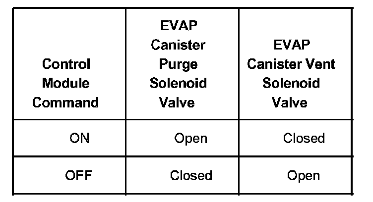 The table illustrates the relationship between the ON and OFF states, and the Open or Closed states of the EVAP canister purge and vent solenoid valves.