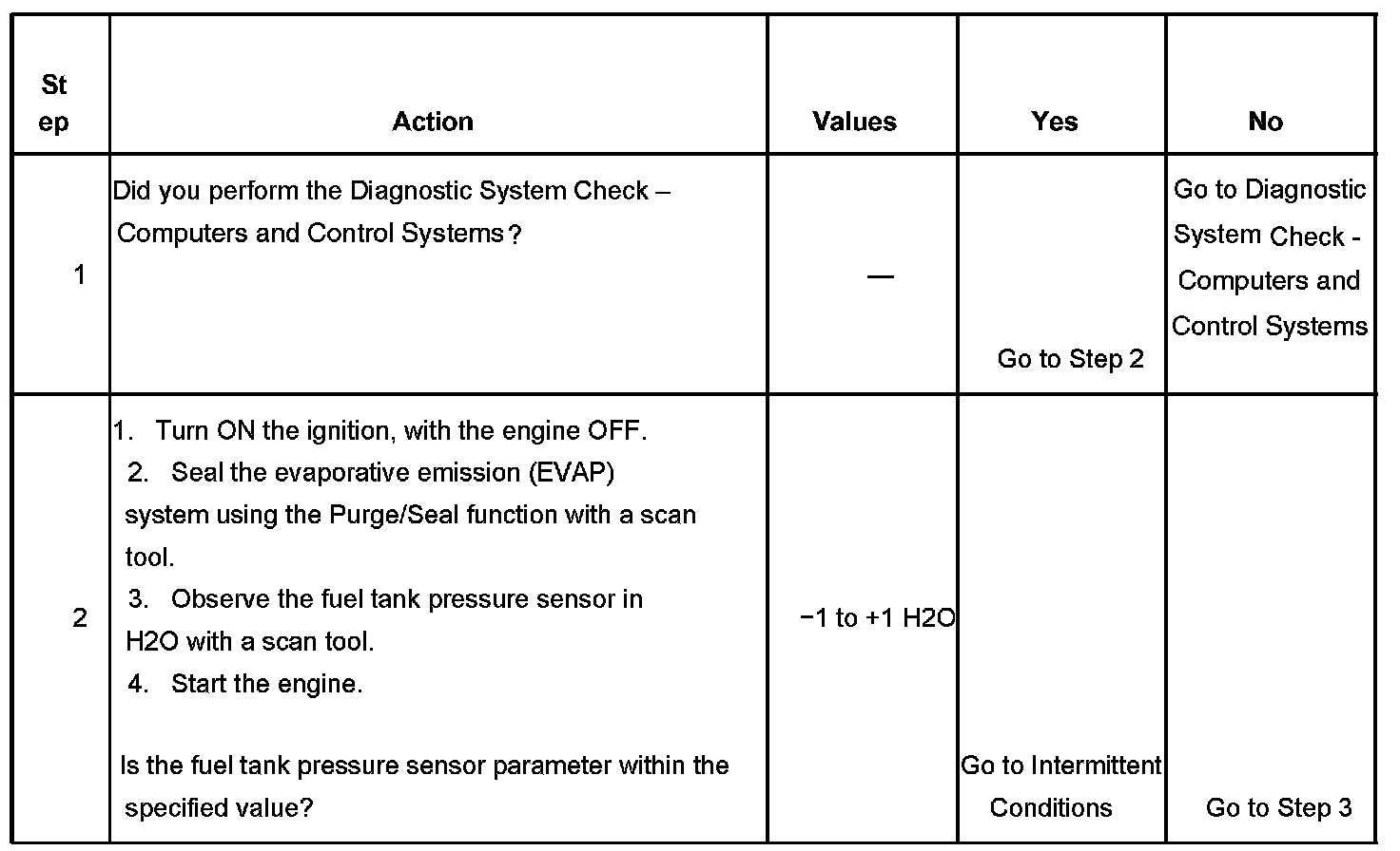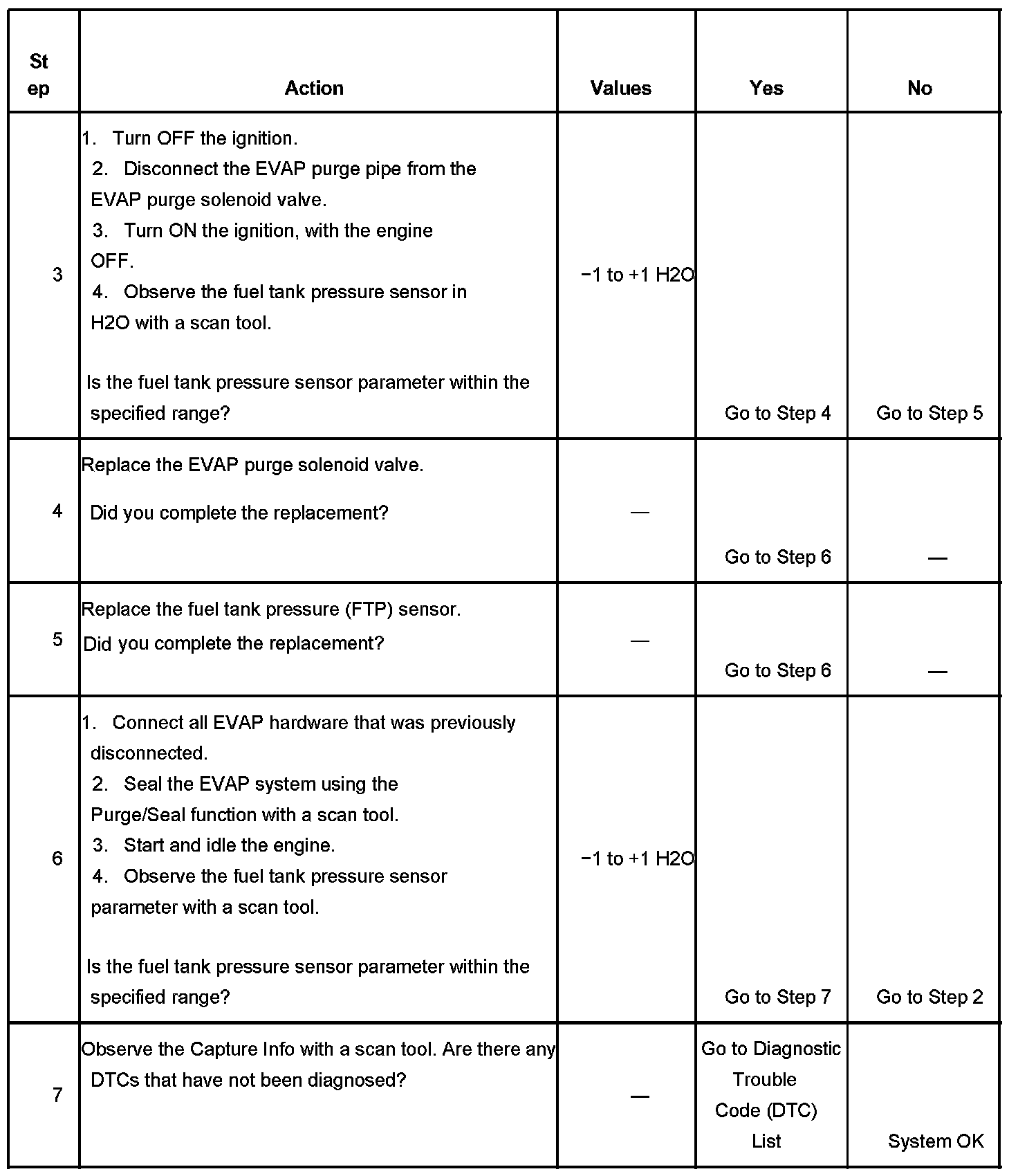 This DTC tests for undesired intake manifold vacuum flow to the evaporative emission (EVAP) system. The control module seals the EVAP system by commanding the EVAP canister purge solenoid valve Closed and the EVAP canister vent solenoid valve Closed. The control module monitors the fuel tank pressure (FTP) sensor to determine if a vacuum is being drawn on the EVAP system. If vacuum in the EVAP system is more than a predetermined value within a predetermined time, this DTC sets.