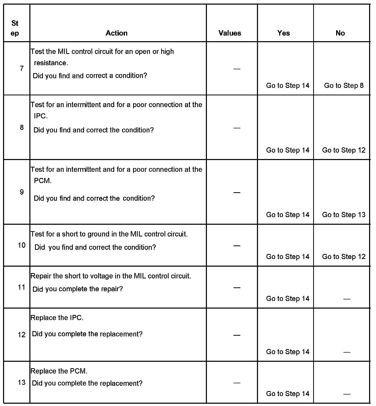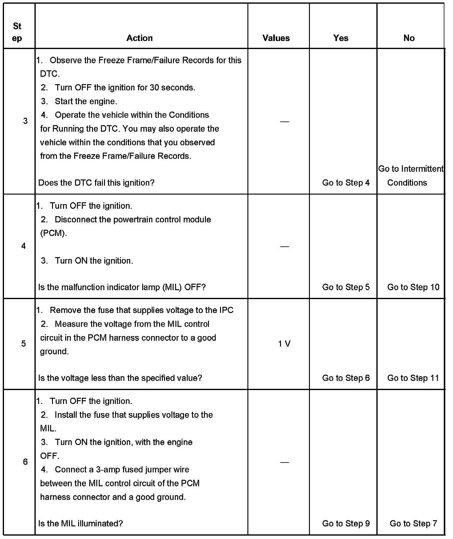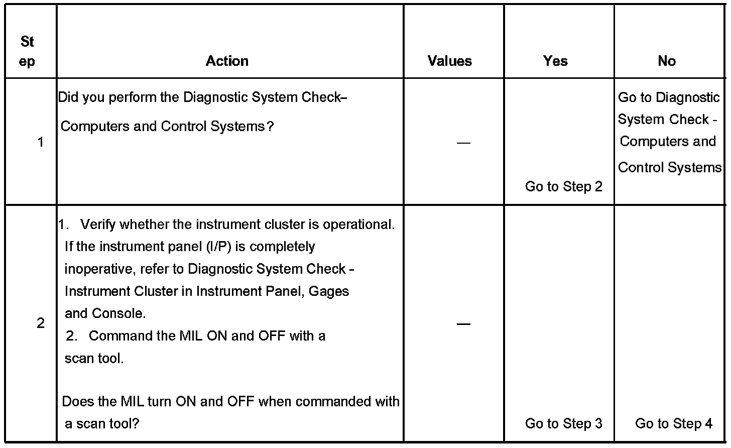 4. This step tests for a short to ground in the MIL control circuit. With the powertrain control module (PCM) disconnected and the ignition ON, the MIL should be OFF.