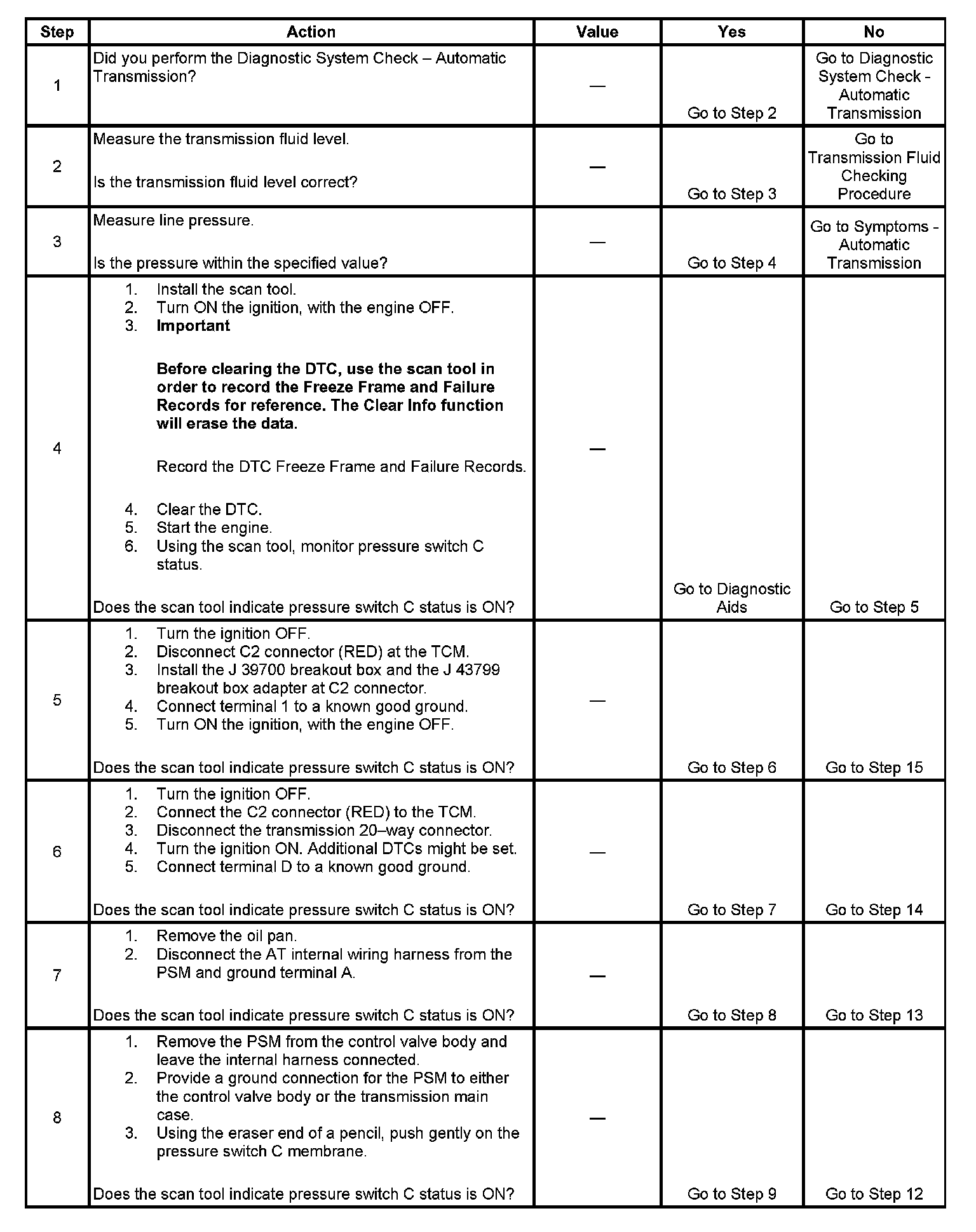 The pressure switch manifold (PSM is a multiple-switch assembly made up of three normally open (N/O) and one normally closed (N/C) pressure switches. The C pressure switch monitors C shift valve positioning and relays it to the transmission control module (TCM). When C pressure switch is in the open state, C shift valve should be in the unstroked position.