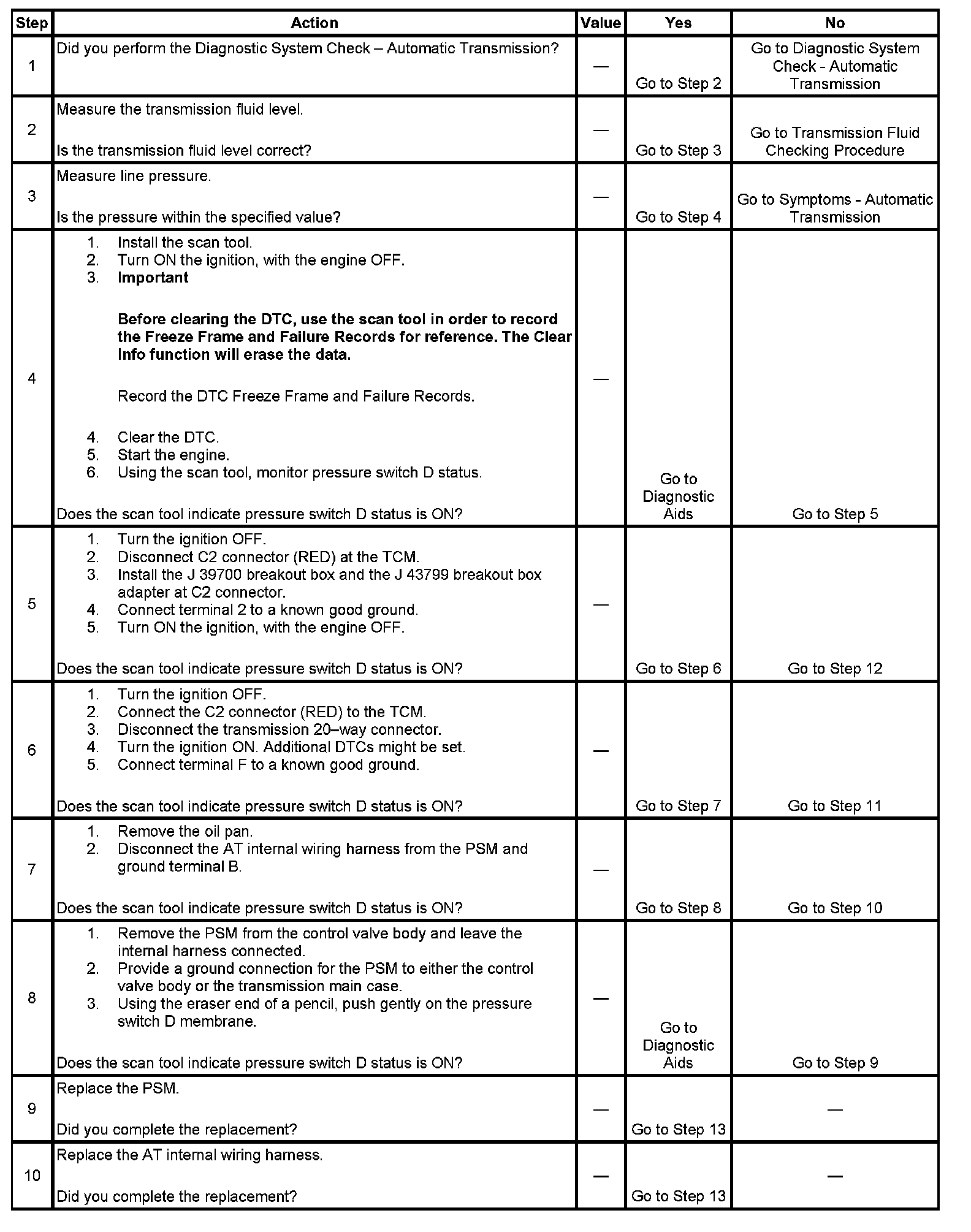DTC P0845 sets during steady state operation when pressure switch D indicates ON for 40 milliseconds after D solenoid has been commanded OFF.