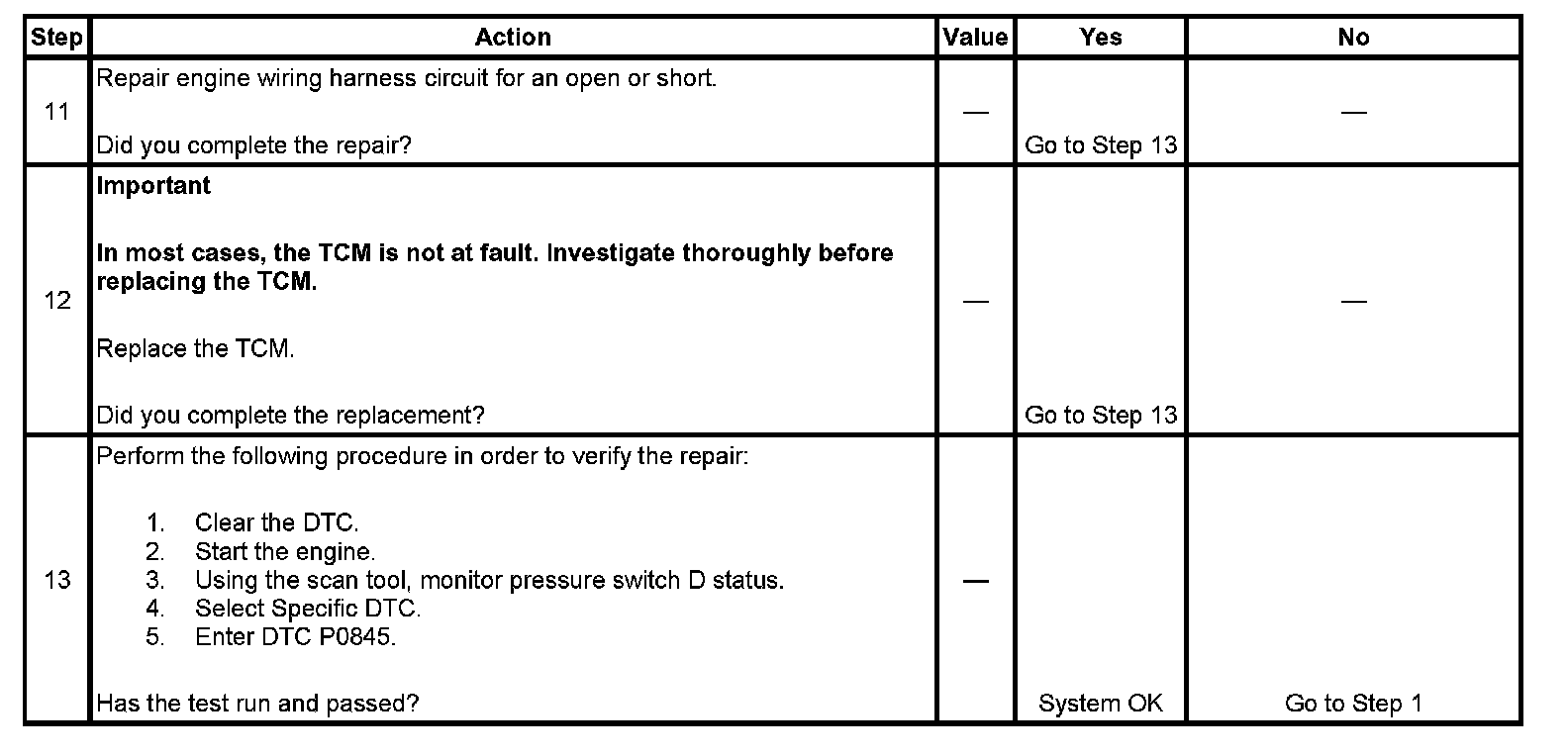 ^ When a P0845 and P0847 are set in combination, this may indicate a short to ground is present at the pressure switch circuit or the shift valve is stuck in the stroked state.