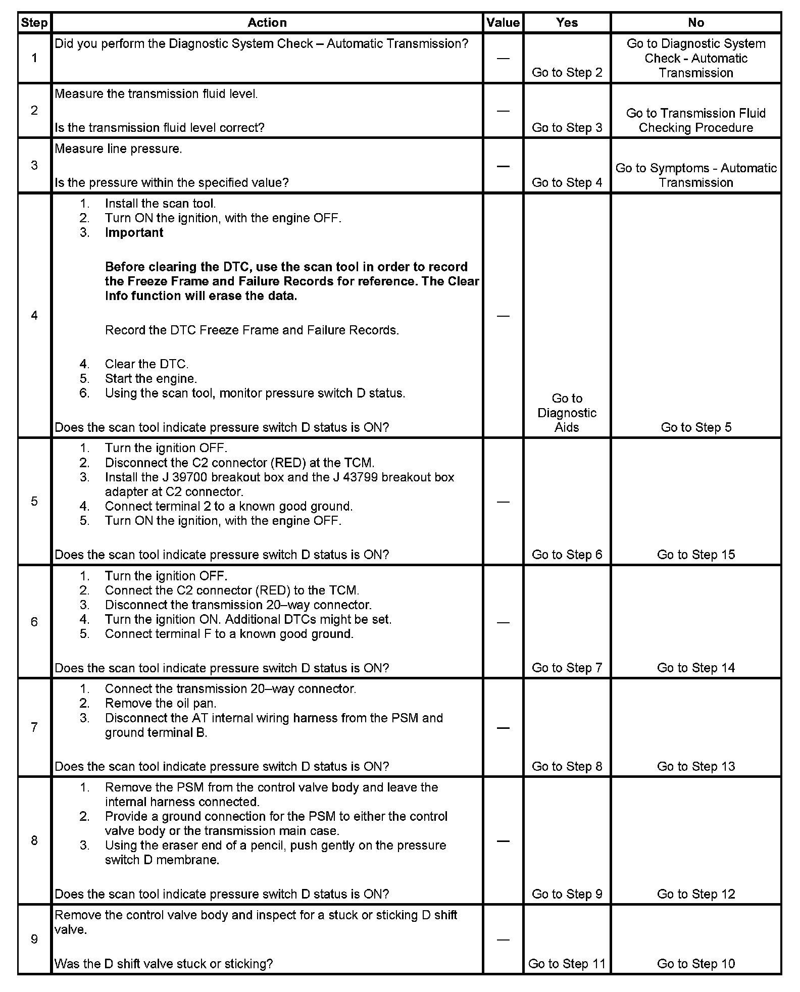 The pressure switch manifold (PSM) is a multiple-switch assembly made up of three normally open (N/O) and one normally closed (N/C) pressure switches. The D pressure switch monitors D shift valve positioning and relays it to the transmission control module (TCM). When D pressure switch is in the open state, D shift valve should be in the unstroked position.
