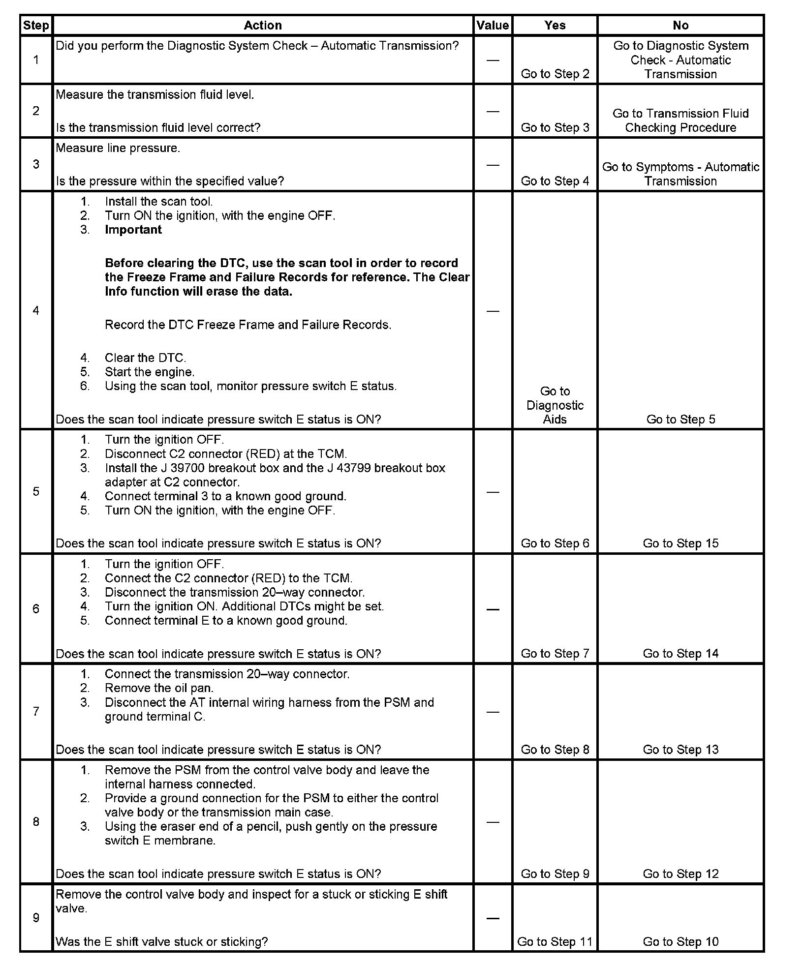 The pressure switch manifold (PSM) is a multiple-switch assembly made up of three normally open (N/O) and one normally closed (N/C) pressure switches. The E pressure switch monitors E shift valve positioning and relays it to the transmission control module (TCM). When E pressure switch is in the open state, E shift valve should be in the unstroked position.