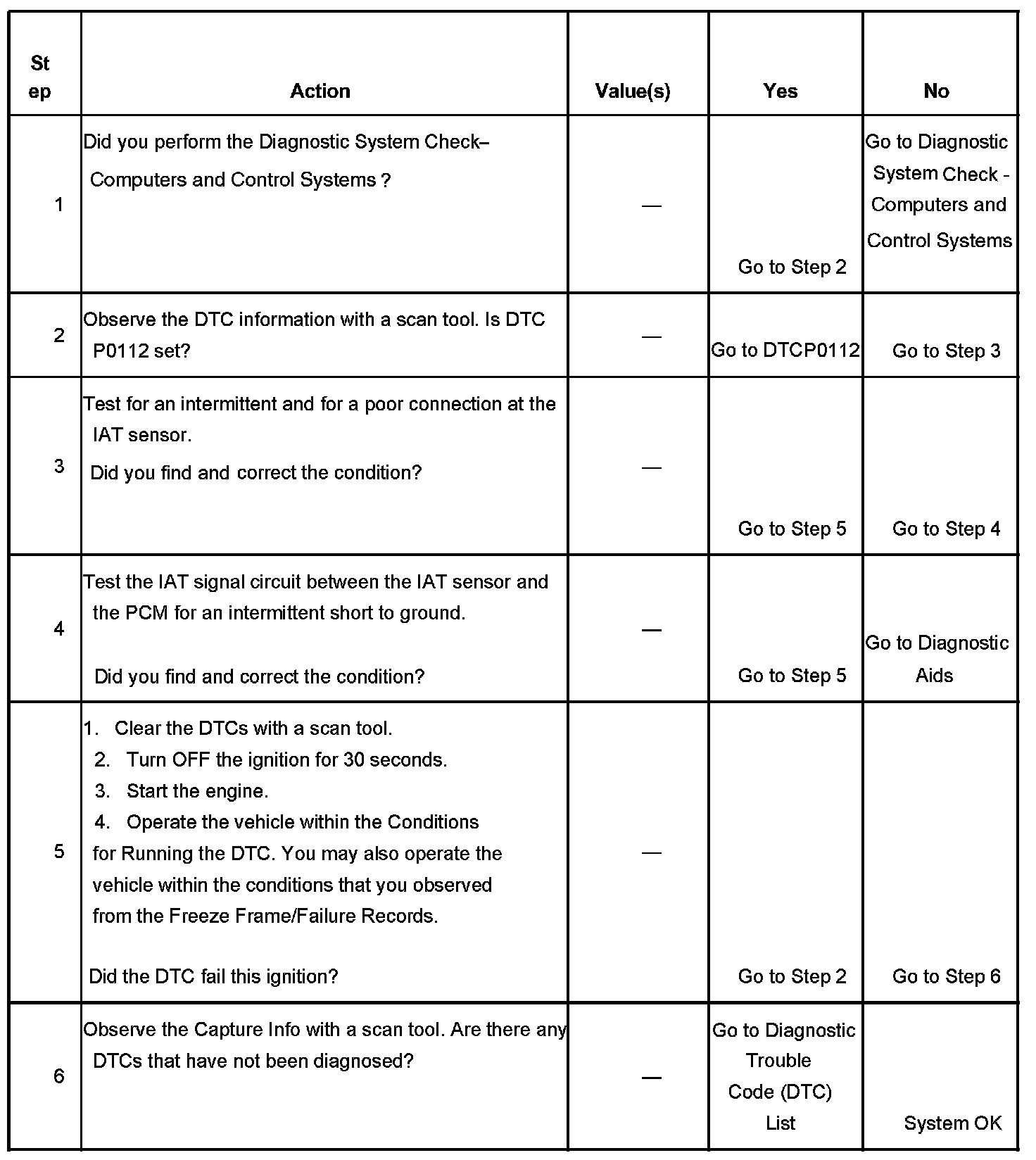 The intake air temperature (IAT) sensor is a variable resistor. The IAT sensor has a signal circuit and a low reference circuit. The IAT sensor measures the temperature of the air entering the engine. The powertrain control module (PCM) supplies 5 volts to the IAT signal circuit and a ground for the IAT low reference circuit. When the IAT sensor is cold, the sensor resistance is high. When the air temperature increases, the sensor resistance decreases. With high sensor resistance, the PCM detects a high voltage on the IAT signal circuit. With lower sensor resistance, the PCM detects a lower voltage on the IAT signal circuit. If the PCM detects an intermittent low IAT signal voltage, indicating a high temperature, DTC P1112 sets.