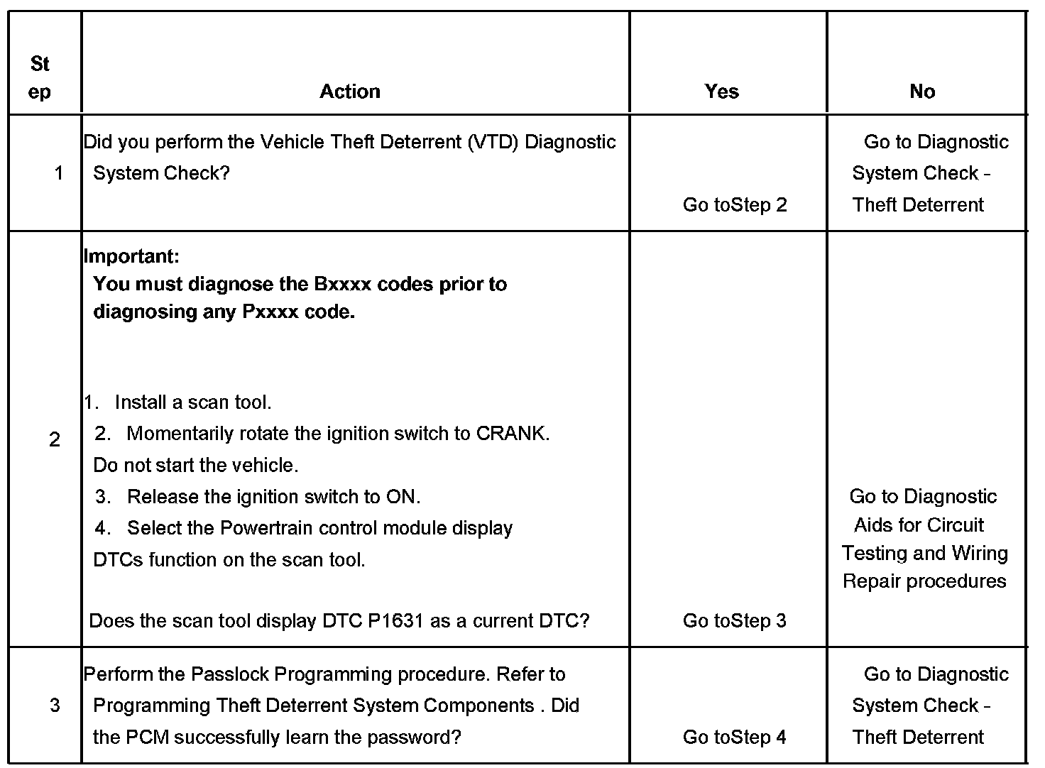 When the passlock portion of the VTD system has sensed the proper operation of the ignition switch and lock, or determined that the switch and lock have not been tampered with, the BCM transmits a password to the PCM. Fuel delivery is enabled if this password matches the password stored in the modules memory. If a component in the theft deterrent system has been replaced, the modules need to relearn the password of the new components. If the relearn procedure was not performed, this diagnostic trouble code (DTC) will set.
