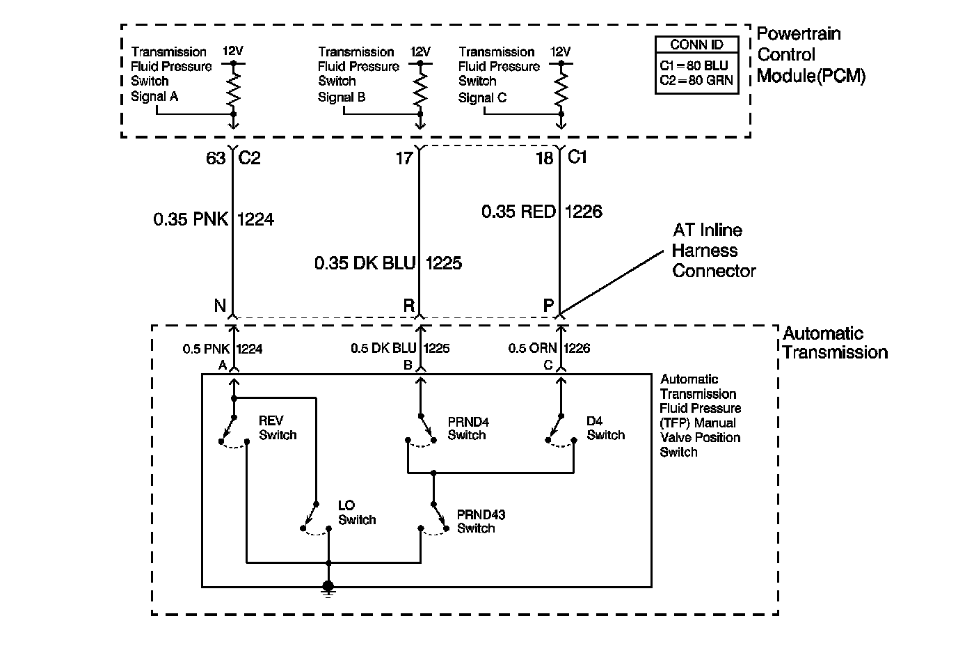 The TFP manual valve position switch assembly cannot distinguish between PARK and NEUTRAL because the monitored valve body pressures are identical in both cases. With the ignition ON and the engine OFF, D2 is indicated. When the transmission 20-way connector is disconnected, the ground potential for the three range signals to the PCM is removed, and with the ignition ON, D2 is indicated.