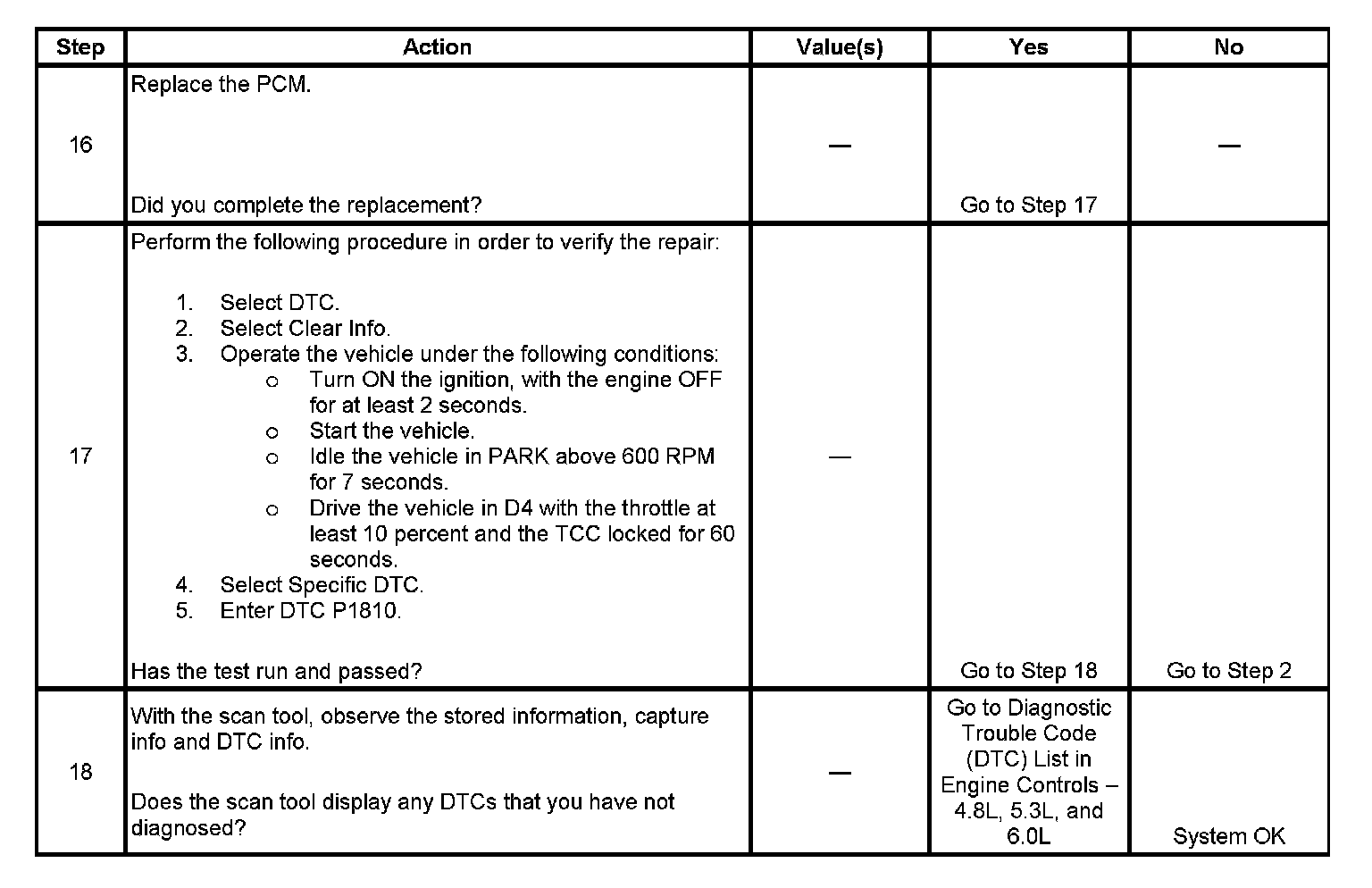 ^ DTC P1810 defaults to an elevated line pressure condition which may result in partial TCC apply. This may produce an idle surge that could stall the engine.