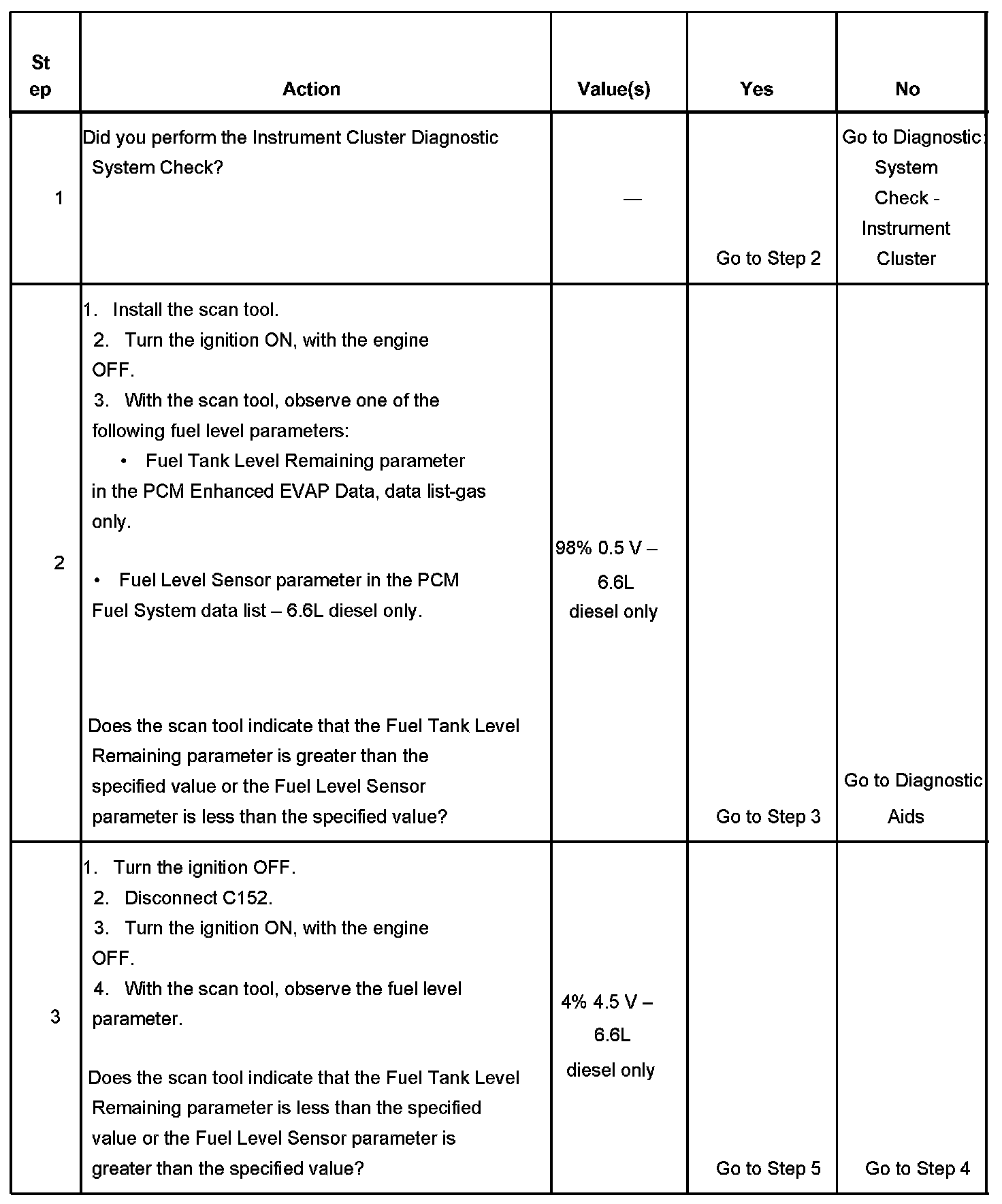 The primary fuel level sender and the secondary fuel level sender changes resistance based on fuel level. The powertrain control module (PCM) monitors the signal circuits of the primary fuel level sender and the secondary fuel level sender in order to determine the fuel level. When the fuel tank is full, the resistance of both fuel level senders are low and the PCM senses a low signal voltage on both the signal circuits of the primary fuel level sender and the secondary fuel level sender. When the fuel tanks are empty, the resistance of the fuel level senders are high and the PCM senses a high signal voltage. The PCM uses the signal circuits of the primary fuel level sender and the secondary fuel level sender in order to calculate the percentage of remaining fuel in the tank. The PCM sends the fuel level percentage via the class 2 serial data circuit to the instrument cluster in order to control the fuel gage. The fuel level information is also used for misfire and evaporative emission (EVAP) diagnostics.