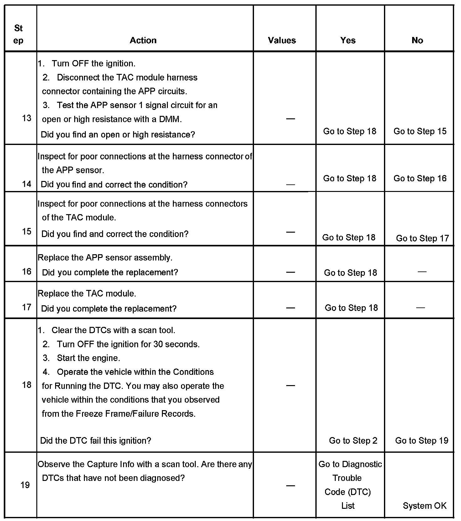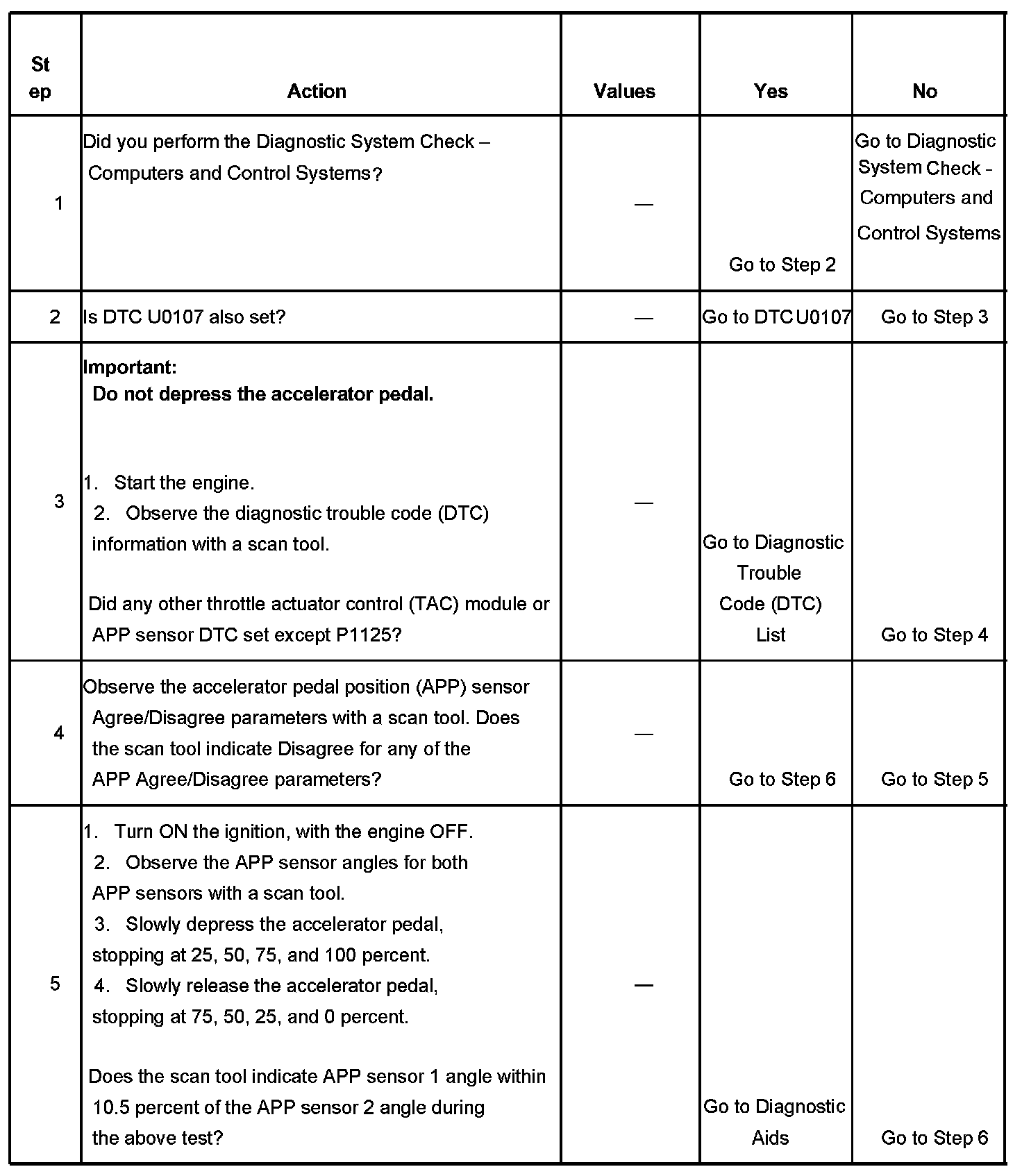 5. This step isolates an internal APP sensor failure. The condition may only occur at a certain accelerator pedal position. Monitoring the APP angles for sensor 2 and sensor 3 is an accurate way of verifying the actual position of the pedal. The APP angles for all 3 sensors should be within a few percent of each other. If the pedal is at rest, the APP angle for all 3 sensors should be 0 percent. If the pedal is fully depressed, all APP angles should be 100 percent.